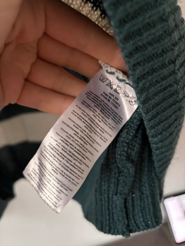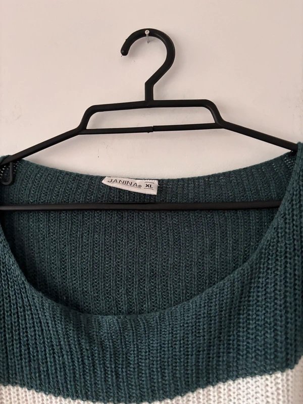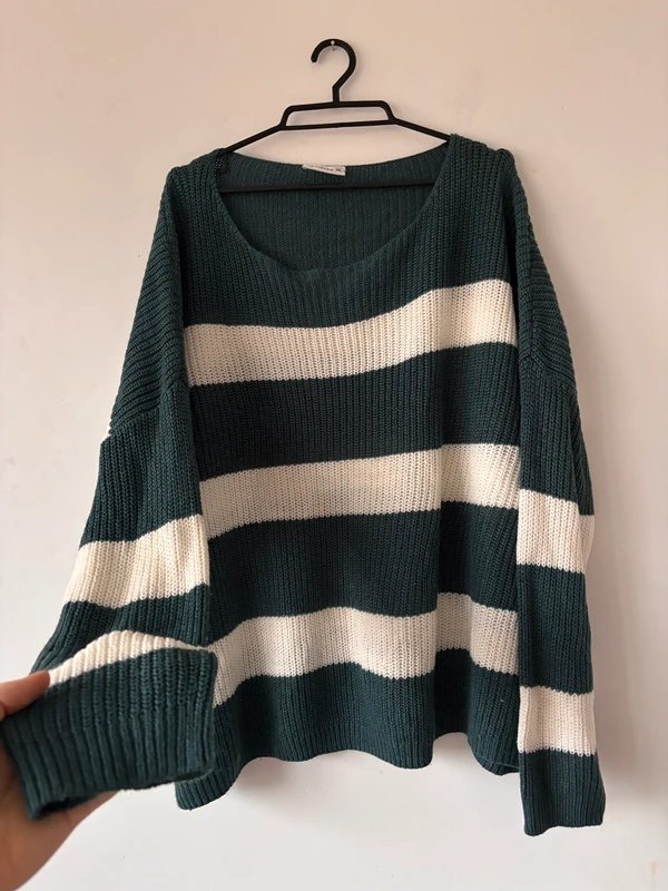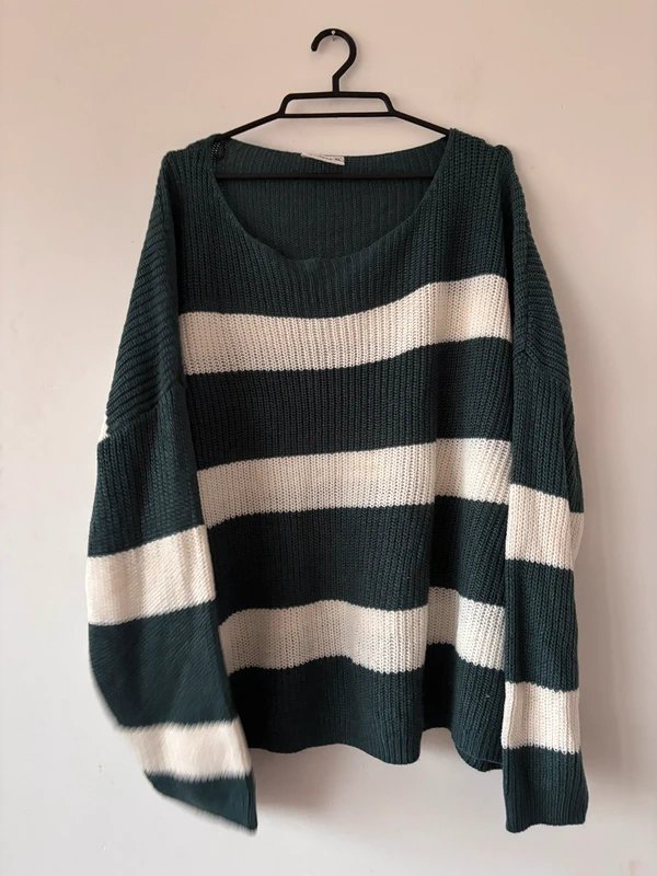 Miękki, dzianinowy sweter JANINA w oversize’owym kroju. Model w ciemnozielono-kremowe, poziome pasy, z szerokim dekoltem i długimi rękawami. Grubszy splot sprawia, że świetnie układa się na sylwetce i jest idealny na chłodniejsze dni. Przyjemny w dotyku, wygodny na co dzień.