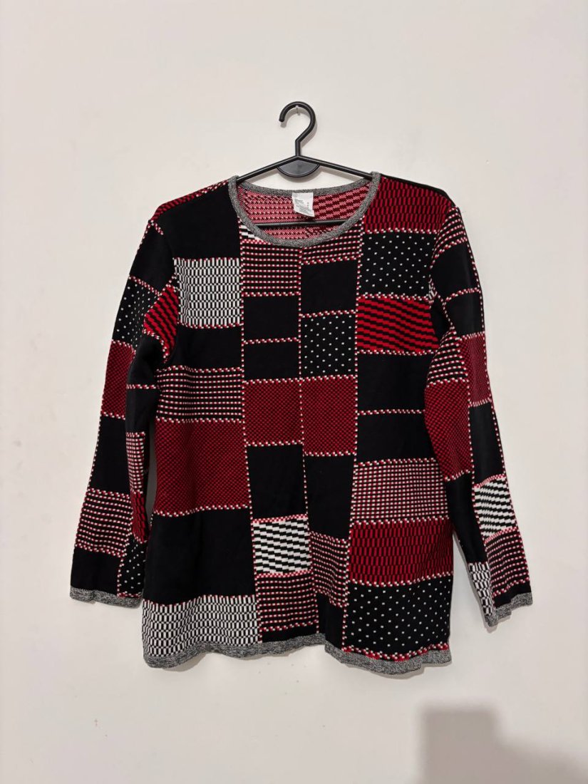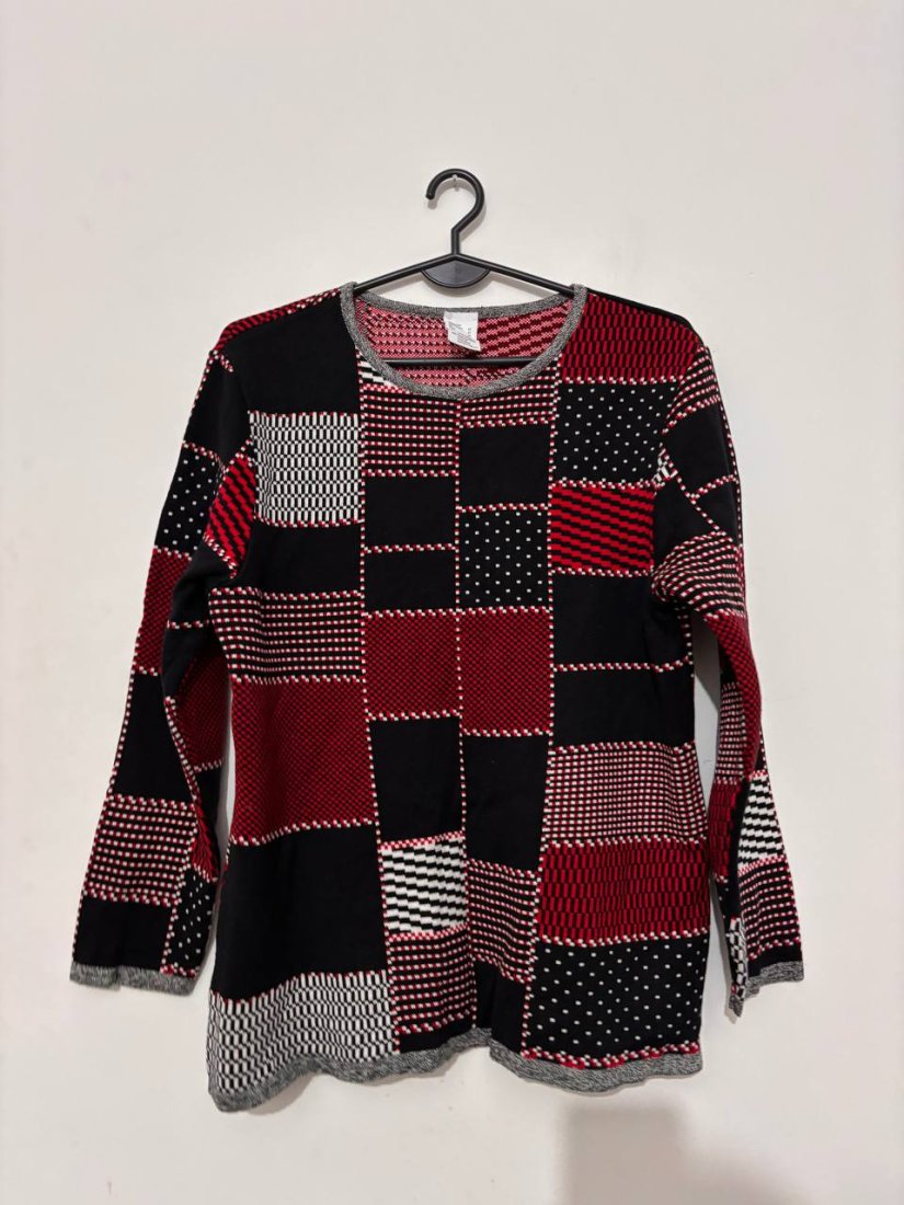 #top #blouse #patchwork #colorful #printed #red #black #grey #cottonblend #softfabric #comfortable #casualwear #dailywear #classicstyle #longtop #patterned #geometric #unique #retrostyle #vintagevibes #everydaylook #stylish #womanfashion #trendytop #midseason #versatile #streetstyle #modernlook #relaxedfit