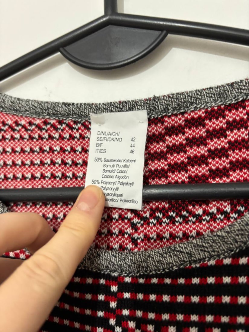 Bluzka w stylu patchwork – połączenie czerni, czerwieni i szarości, tworzące efektowny geometryczny wzór. Model z okrągłym dekoltem, rękawami 3/4 i ozdobnym wykończeniem na brzegach. Materiał pół na pół: 50% bawełna i 50% poliakryl – komfortowa, miękka i przyjemna dla skóry. Idealna do codziennych stylizacji, bardzo wygodna i oryginalna.