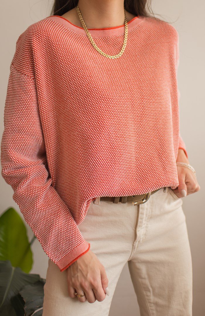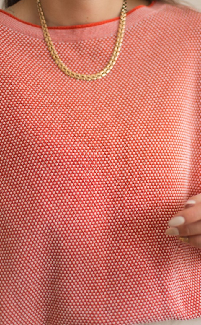 Pomarańczowo-biały sweter z bawełny.