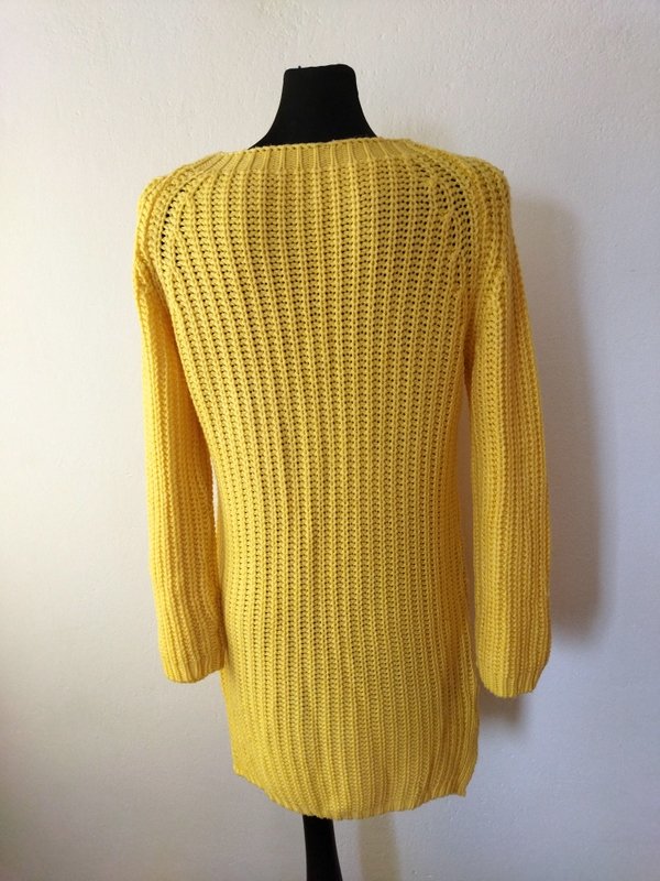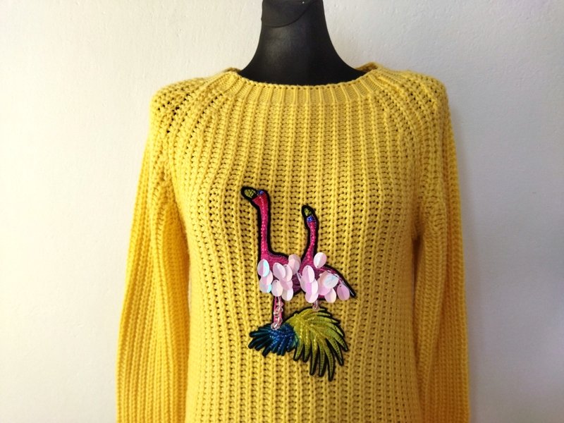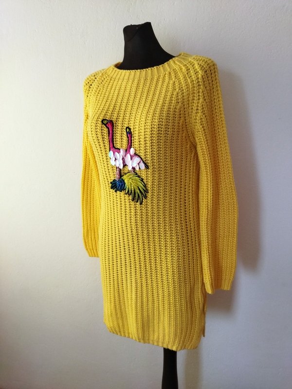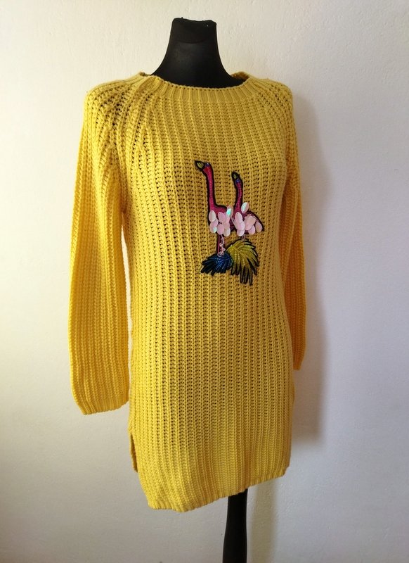 Miły dłuższy sweter /tunika z akrylowej włóczki w żółtym kolorze wykonany ściegiem angielskim z aplikacja flamingów. Z raglanowymi rękawami, z rozcięciami po bokach.