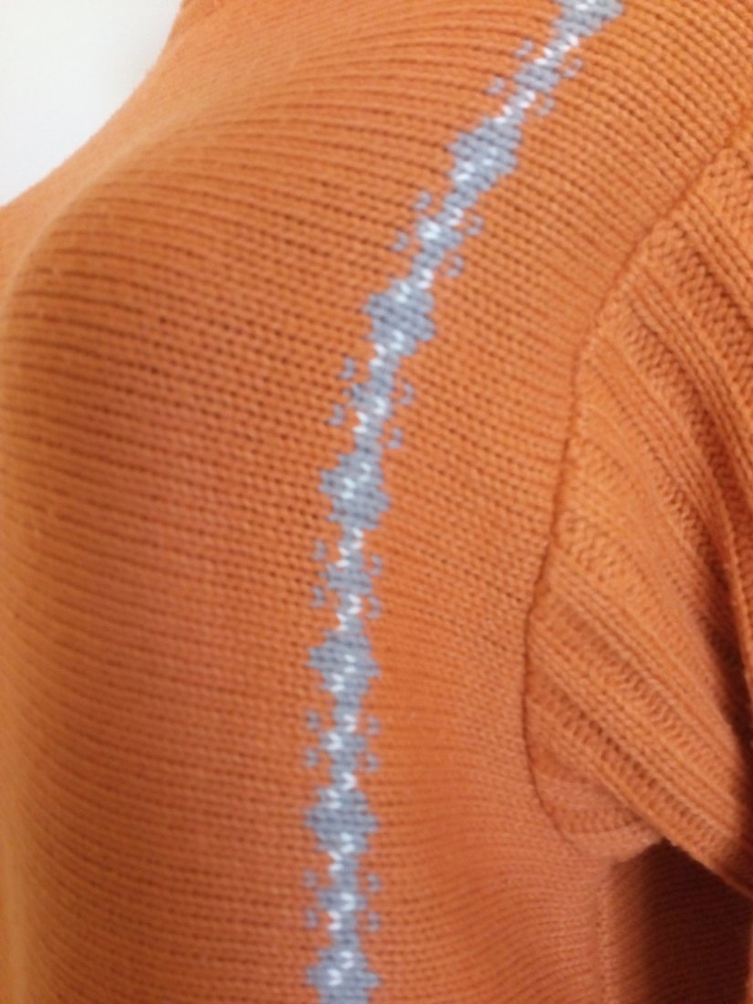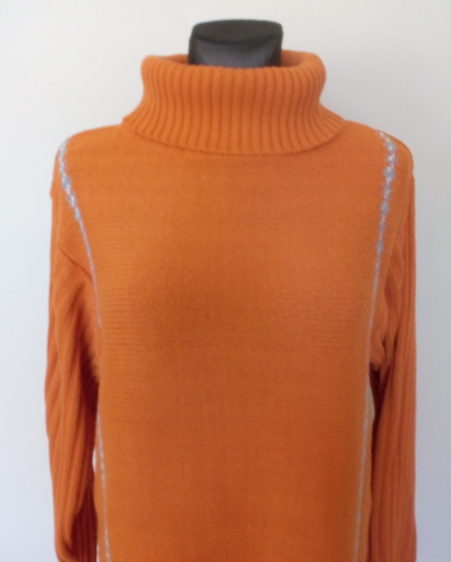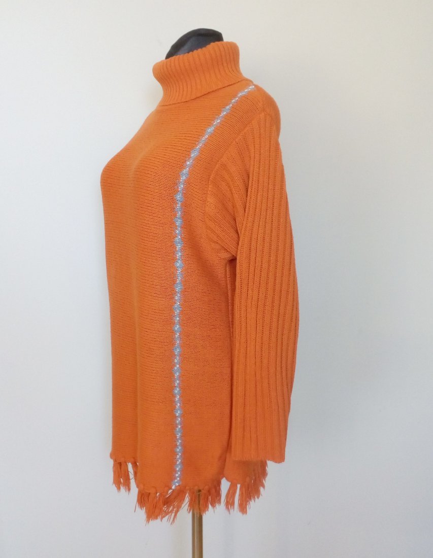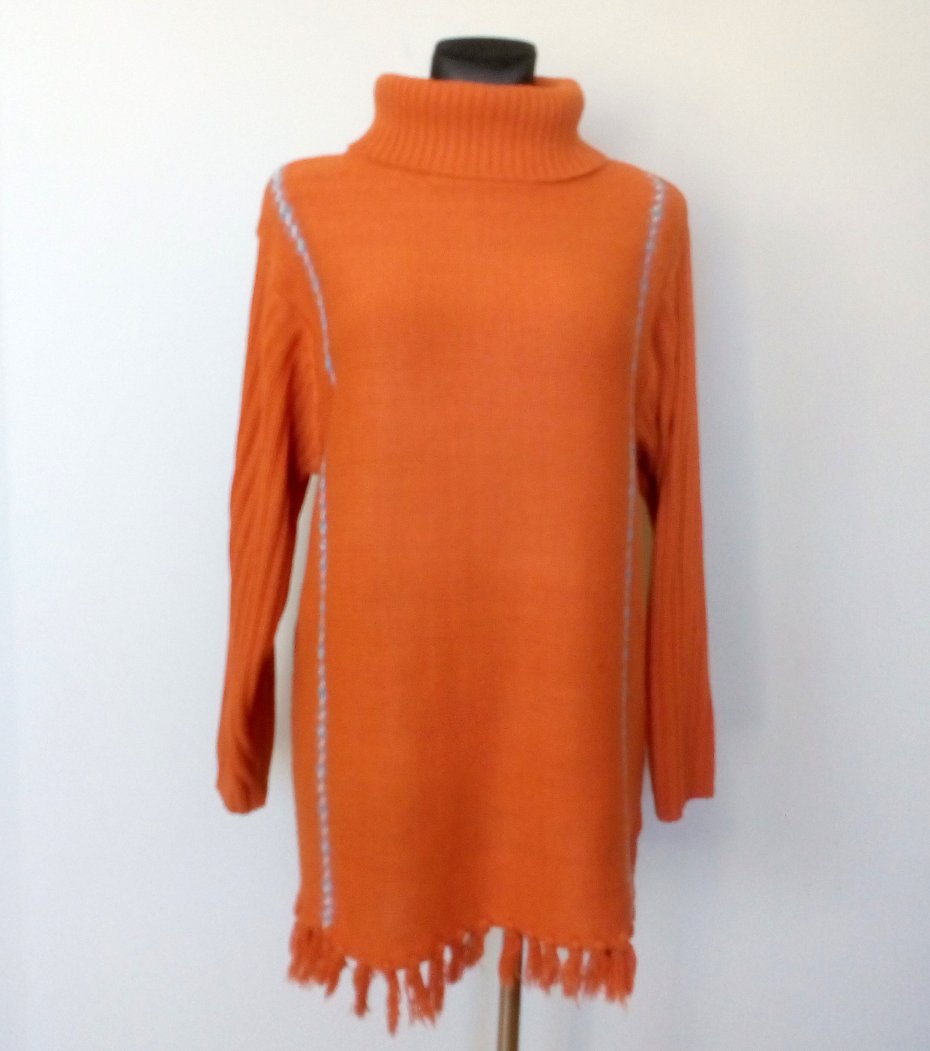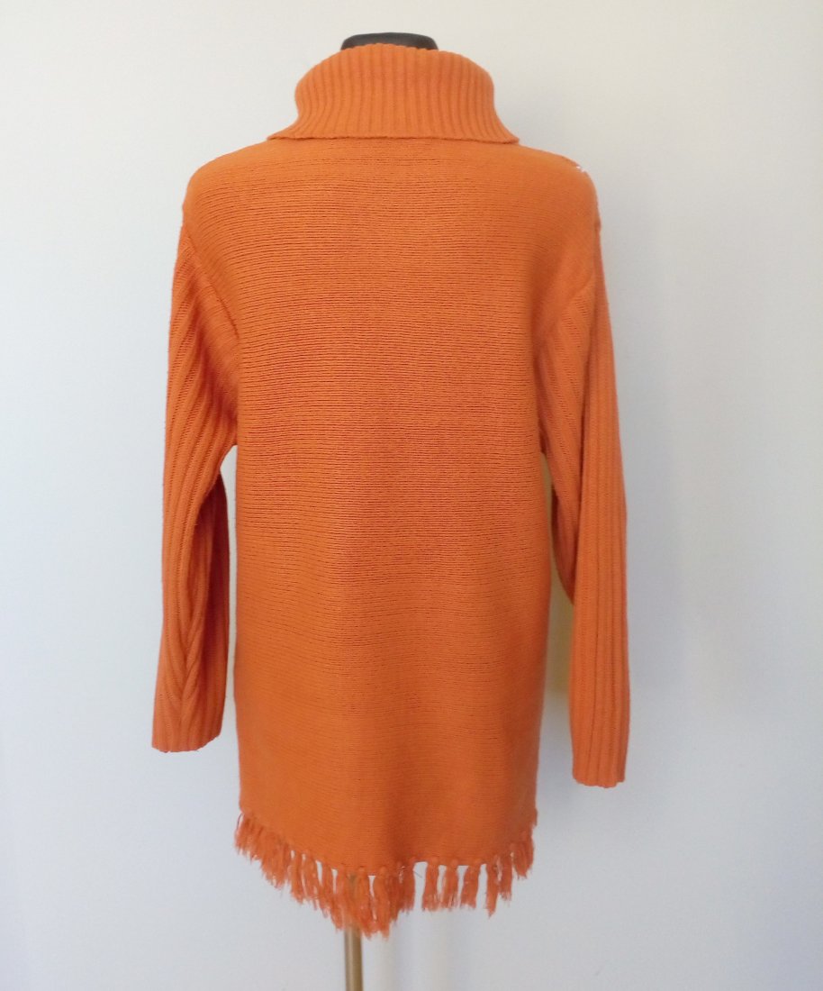 Długi sweter z odwijanym golfem, w rudym/pomarańczowym kolorze, rękawy ze ściągaczowym wzorem, u dołu swetra frędzle