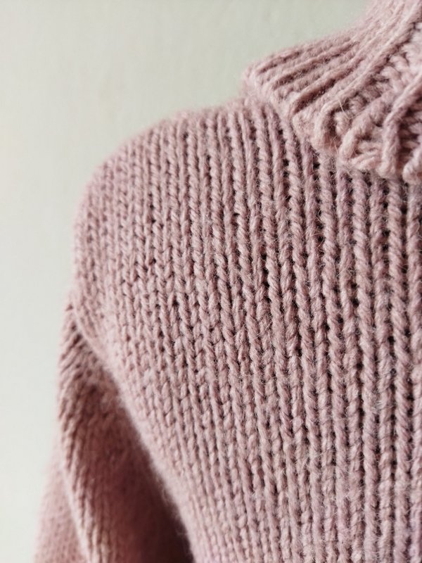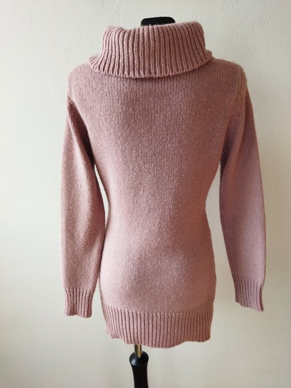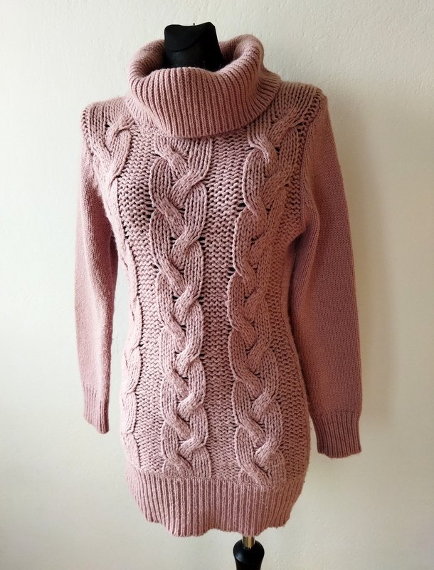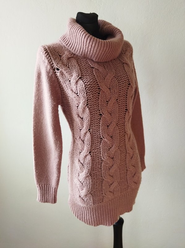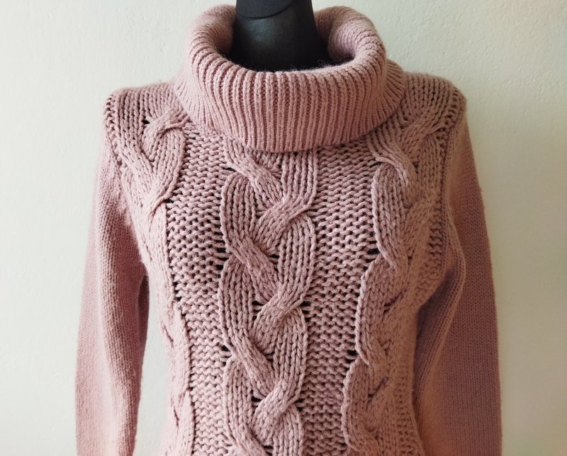 Ciepły dłuższy sweter z warkoczowym wzorem w kolorze zgaszonego różu. Z dużym luźnym golfem . Wykończony ściągaczami.