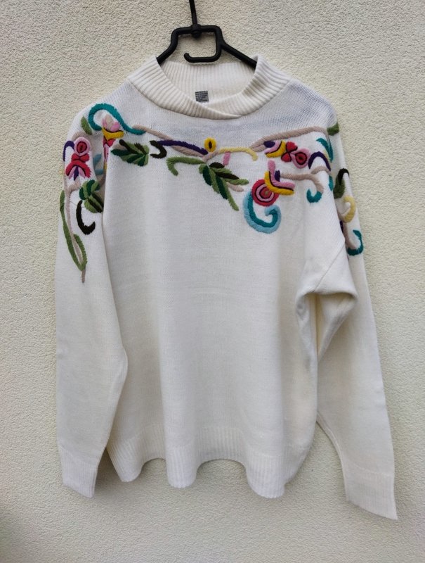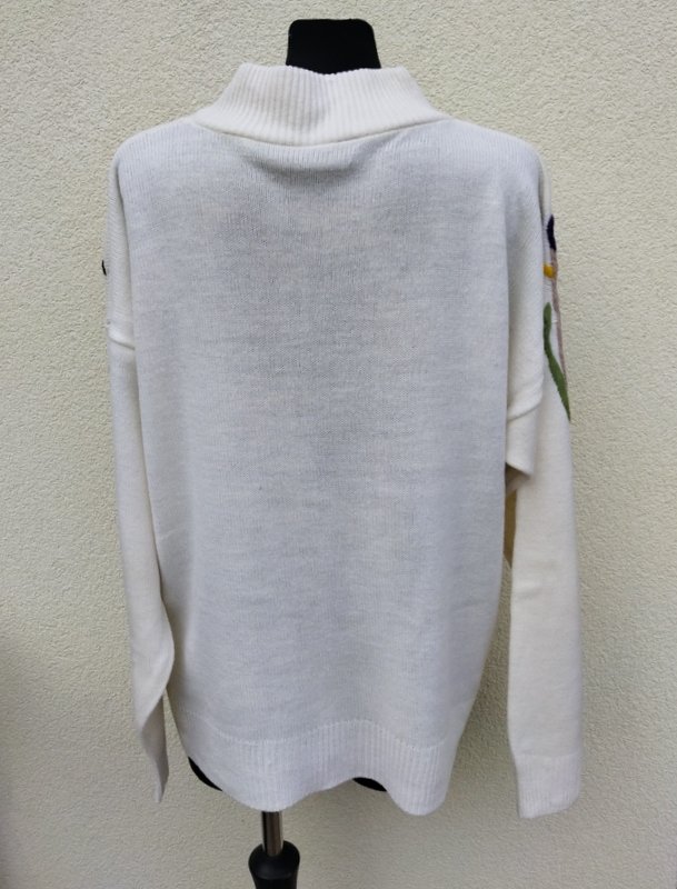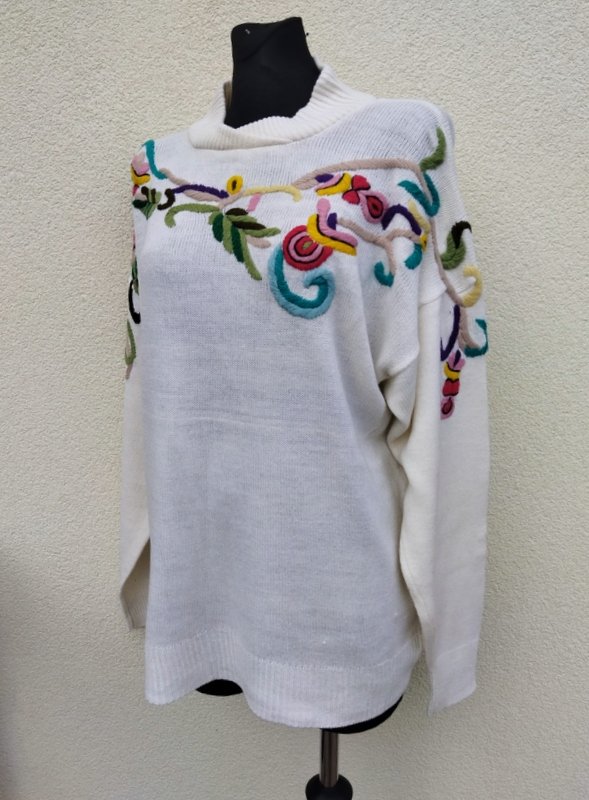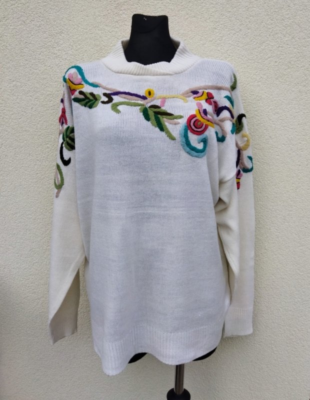 Uroczy miły akrylowy sweter w kolorze mlecznej bieli zdobiony kolorowym haftem, z obniżona linią ramion. wykończony ściągaczami