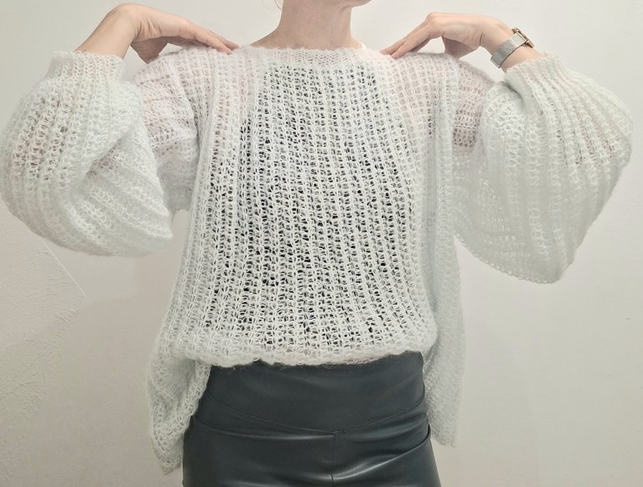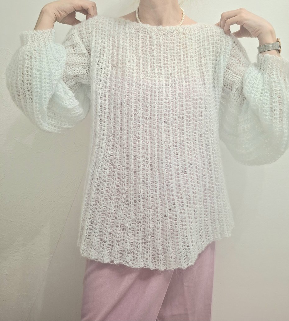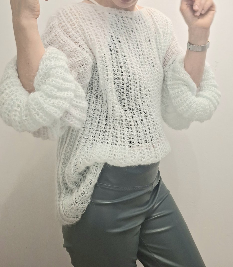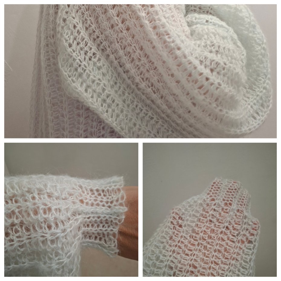 Sweter z moheru jest biały, ale ma lekki morski odcień