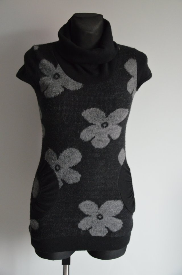 Dzianinowy długi sweterek z kieszonkami. Krótki rękawek. Czarny z motywem kwiatów w kolorze popielatym. W dotyku bardzo miły. Pod szyją luźny, wywijany golf. Na dole ściągacz. Elastyczny.