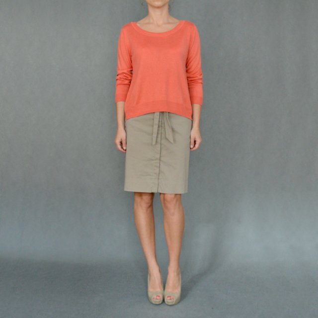Cienki sweterek w kolorze ni to koral ni pomarańcz od H&M. Rękawki 3/4. Przód troszkę krótszy.