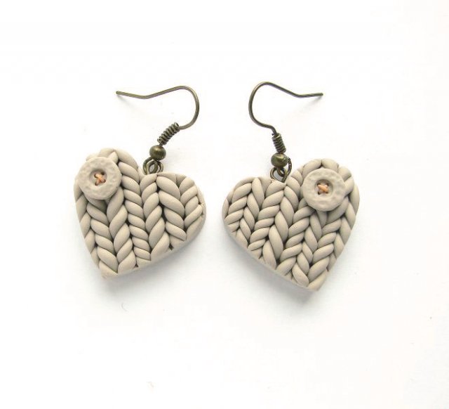 Urocze kolczyki w kształcie szarych swetrowych serduszek z guziczkami wykonane ręcznie z masy fimo. Wielkość 2,5 cm, bigle w kolorze starego złota