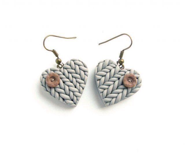 Urocze kolczyki w kształcie szarych swetrowych serduszek z guziczkami wykonane ręcznie z masy fimo. Wielkość 2,5 cm, bigle w kolorze starego złota
