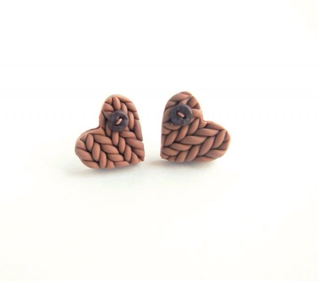 Urocze malutkie kolczyki sztyfty w kształcie brązowych sweterkowych serduszek z guziczkiem wykonane ręcznie z masy fimo. Wielkość ok 1,5 cm. Zatyczki w zestawie