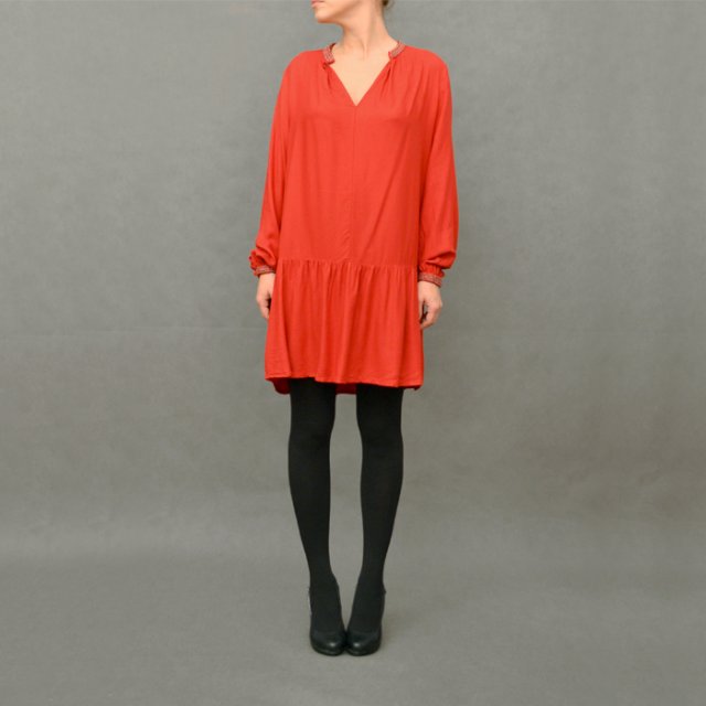 Śliczna sukienka lub tunika z szerszą falbaną na dole. Dekolt w serek wykończony koralikami, podobnie mankiety. Bez podszewki. Nie prześwituje. Idealna na świąteczny czas.