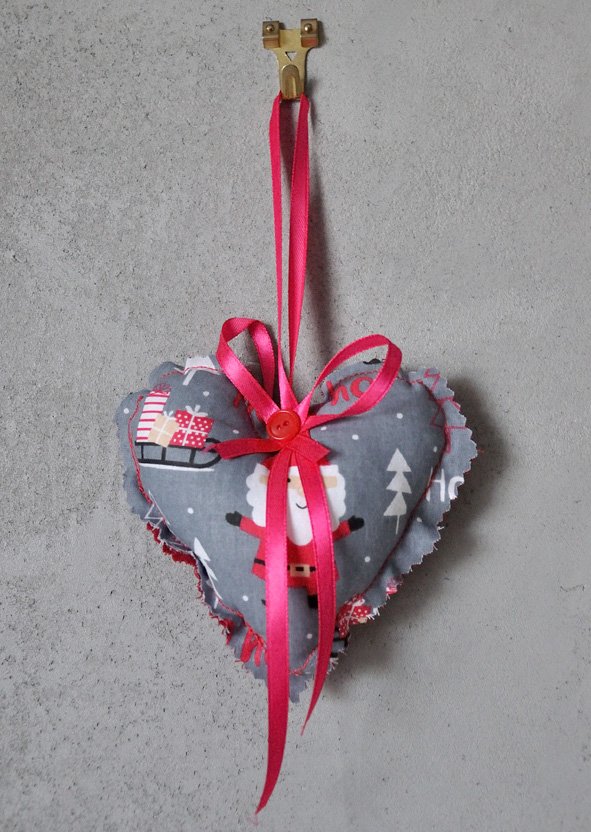 Ręcznie wykonana, świąteczna dekoracja w kształcie serca. Ozdoba wykonana z tkaniny w szaro-białe wzory świąteczne (kreskówkowy Mikołaj), przewiązana różową wstążką. Idealna jako zawieszka na choinkę lub dekoracja domu na Boże Narodzenie.