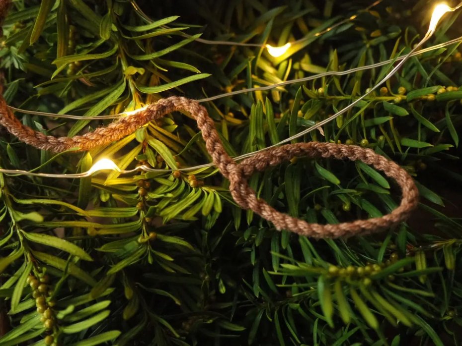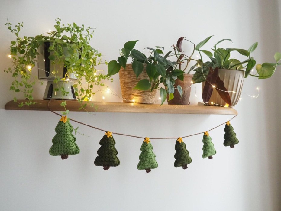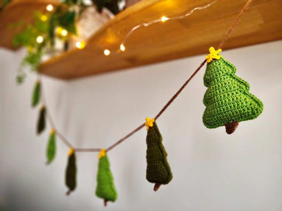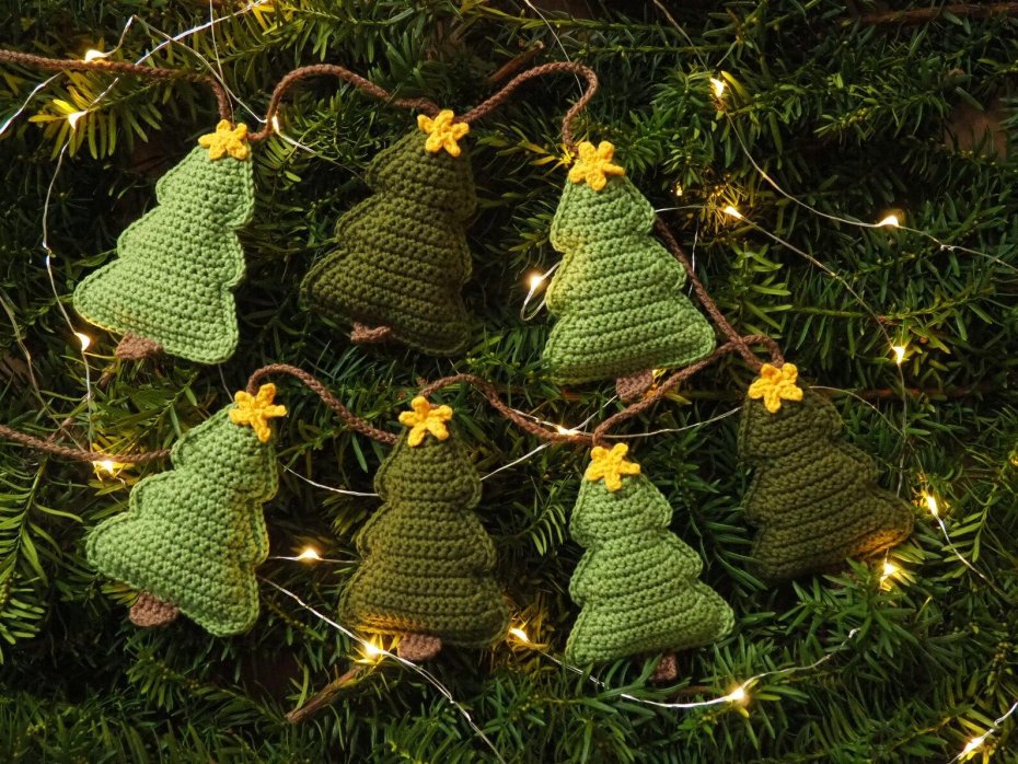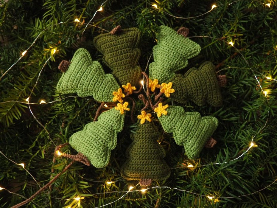 Składa się z siedmiu szydełkowych choinek ozdobionych gwiazdkami, wykonana z dwóch kolorów zielonej włóczki.