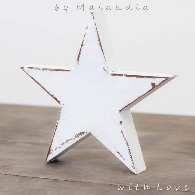 Drewniana, ręcznie malowana gwiazda, malowana metodą shabby chic, z wyraźnym efektem postarzania.