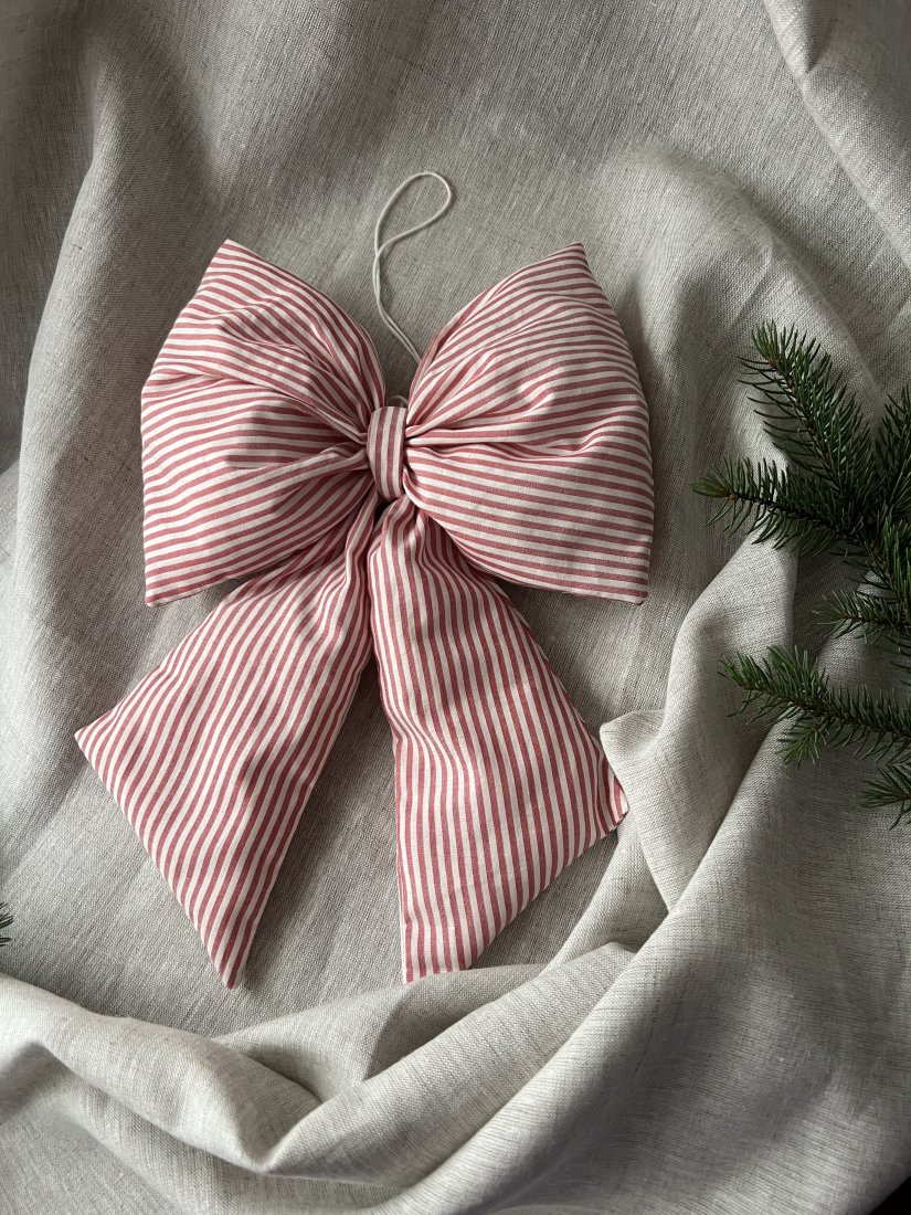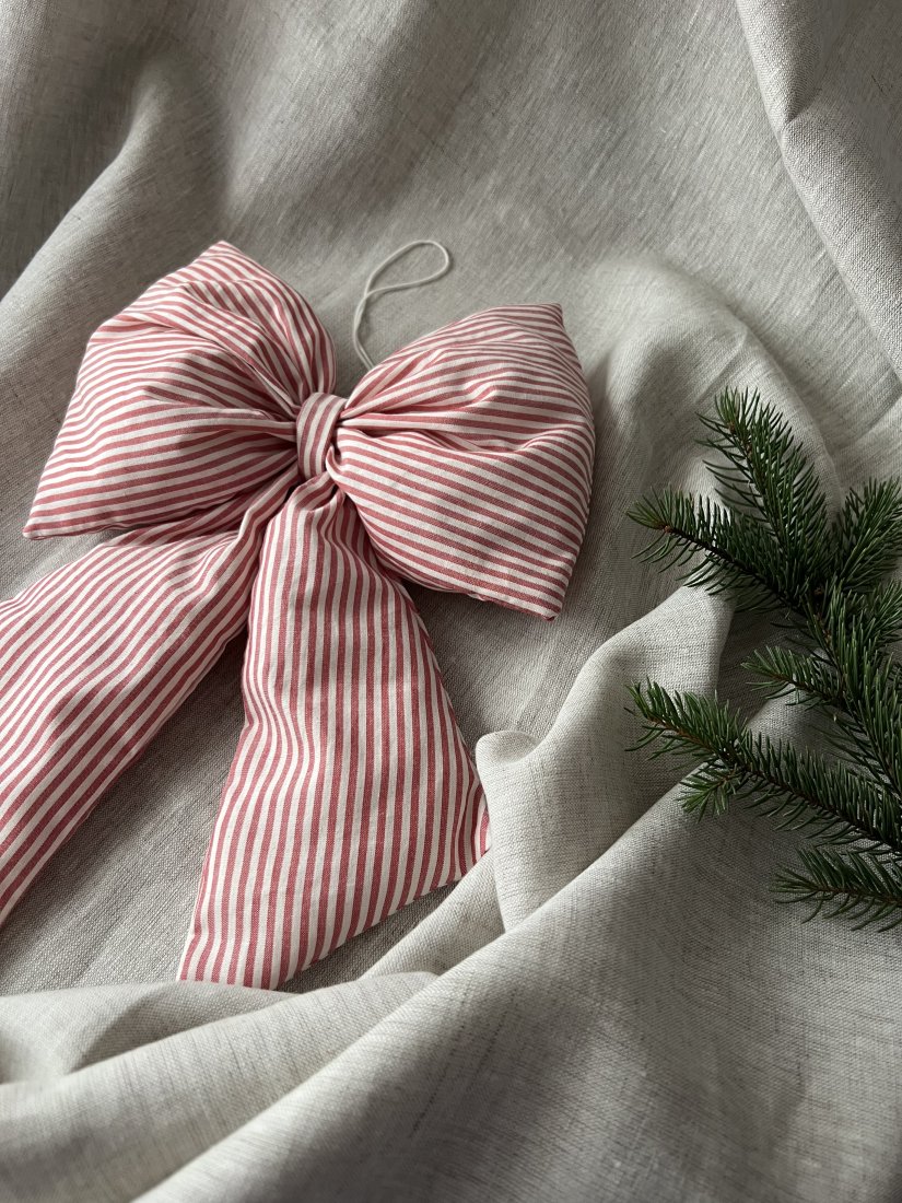 Duża świąteczna kokardka wykonana z tkaniny z domieszką lnu i bawełny to wyjątkowa ozdoba, która doda uroku każdemu wnętrzu. Dzięki wypełnieniu w środku zachowuje pełny, elegancki kształt. Idealna jako dekoracja choinki, drzwi, kominka…