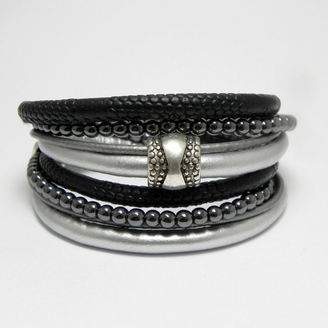 Bransoletka z serii 2w1, dla wielbicielek i kamieni, i rzemyków, przeznaczona do dwukrotnego owinięcia wokół nadgarstka, wykonana została tylko w JEDNYM EGZEMPLARZU, z rzemieni ze skóry ekologicznej, drobnych kuleczek hematytu (4 mm) oraz elementów metalowych w kolorze srebrnym. Będzie odpowiednia na nadgarstek 14-16 cm.