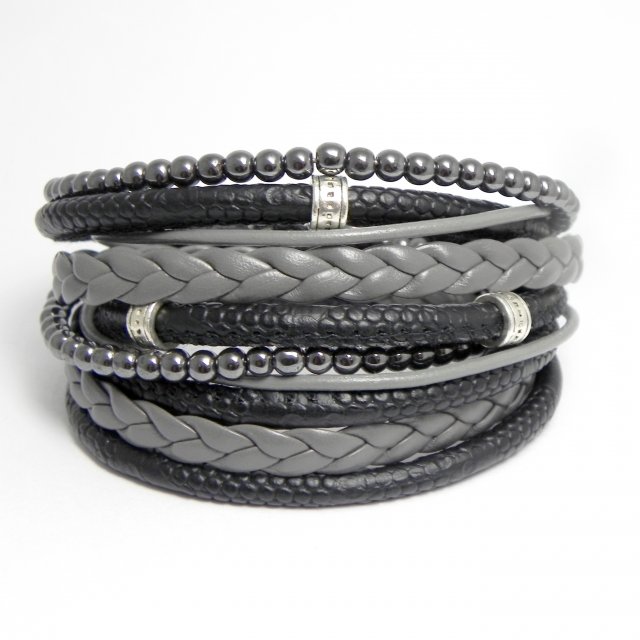Bransoletka z serii 2w1, dla wielbicielek i kamieni, i rzemyków, przeznaczona do dwukrotnego owinięcia wokół nadgarstka, wykonana została tylko w JEDNYM EGZEMPLARZU, z rzemieni ze skóry ekologicznej i naturalnej, drobnych kuleczek hematytu (4 mm) oraz elementów metalowych w kolorze srebrnym. Będzie odpowiednia na nadgarstek 16-17 cm.
