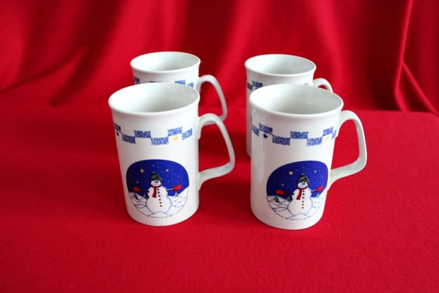4 kubki porcelanowe z uroczymi kolorowymi bałwankami.