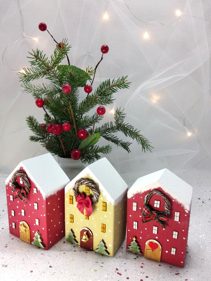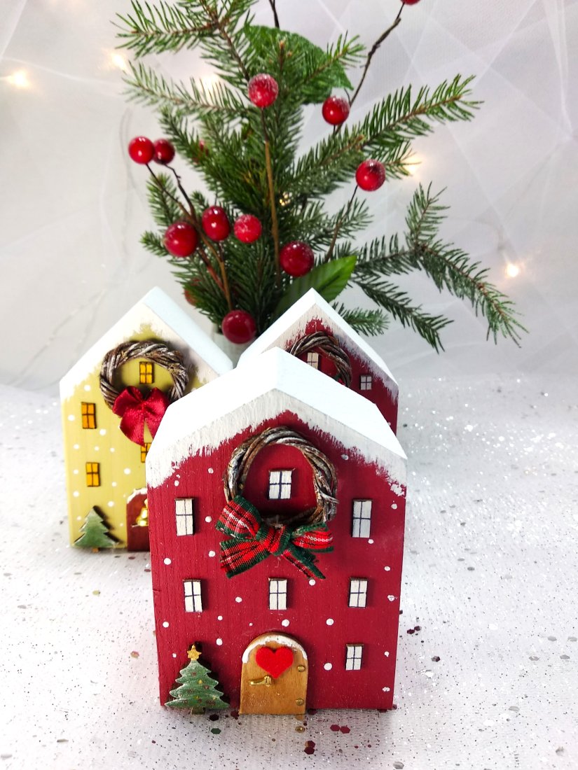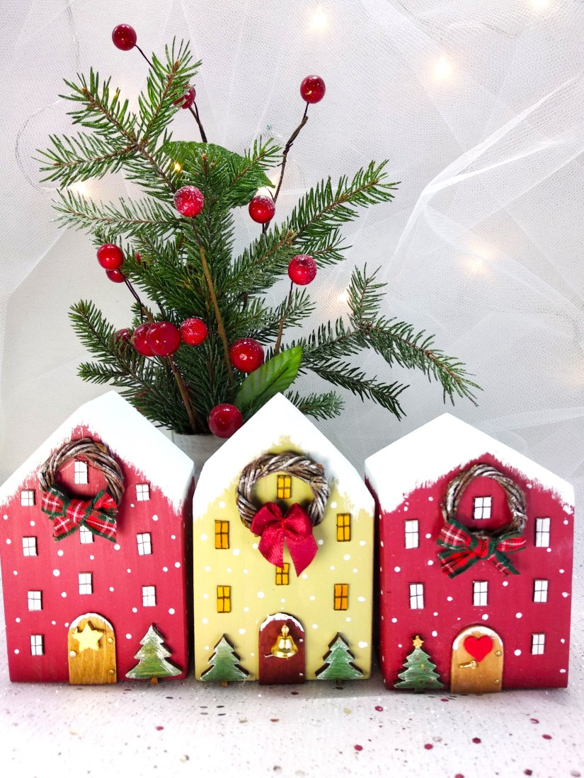 Trzy dekoracyjne domki wykonane są z drewna sosnowego i pomalowane akrylową ekologiczną farbą. Domki są uroczą i oryginalną dekoracją świąteczną, która wprowadzi do każdego wnętrza ciepłą i przytulną atmosferę. Mogą być samodzielną dekoracją, ale również elementem większej kompozycji np. postawione wsród choinek z moich innych aukcji. Świetnie prezentują się na półce, komodzie lub parapecie.
