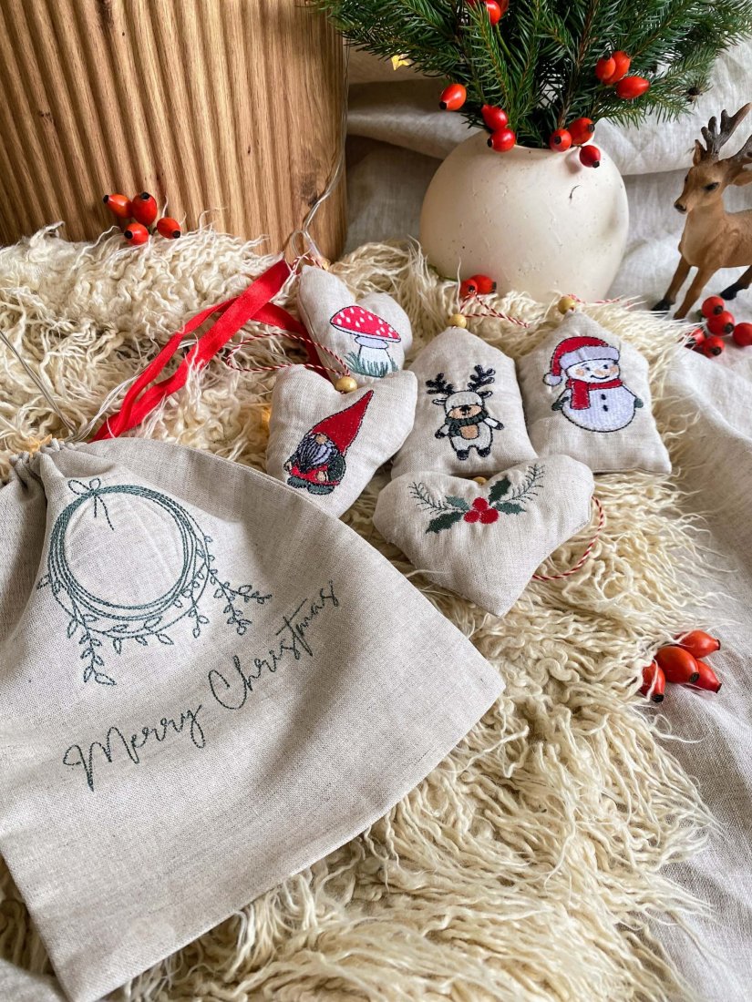 Cały zestaw zapakowany jest w lniany woreczek z haftem świątecznym, przewiązany czerwonymi wstążkami — gotowy do wręczenia jako prezent lub przechowania dekoracji.