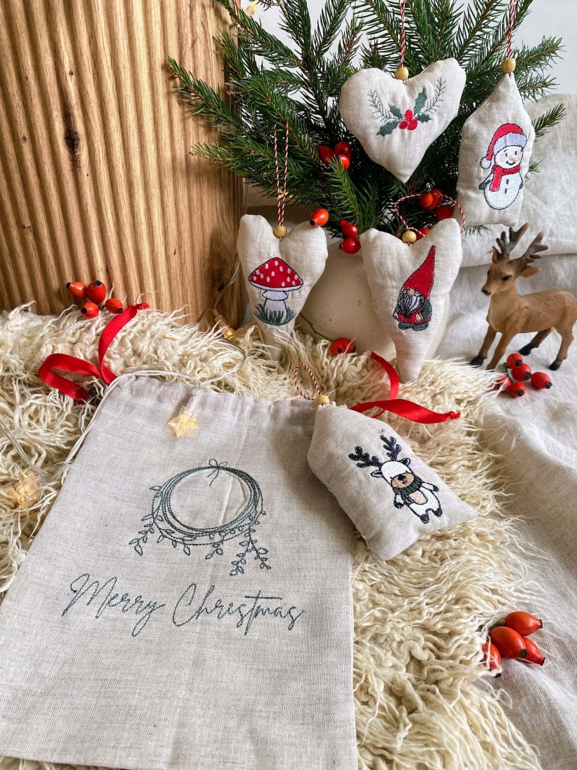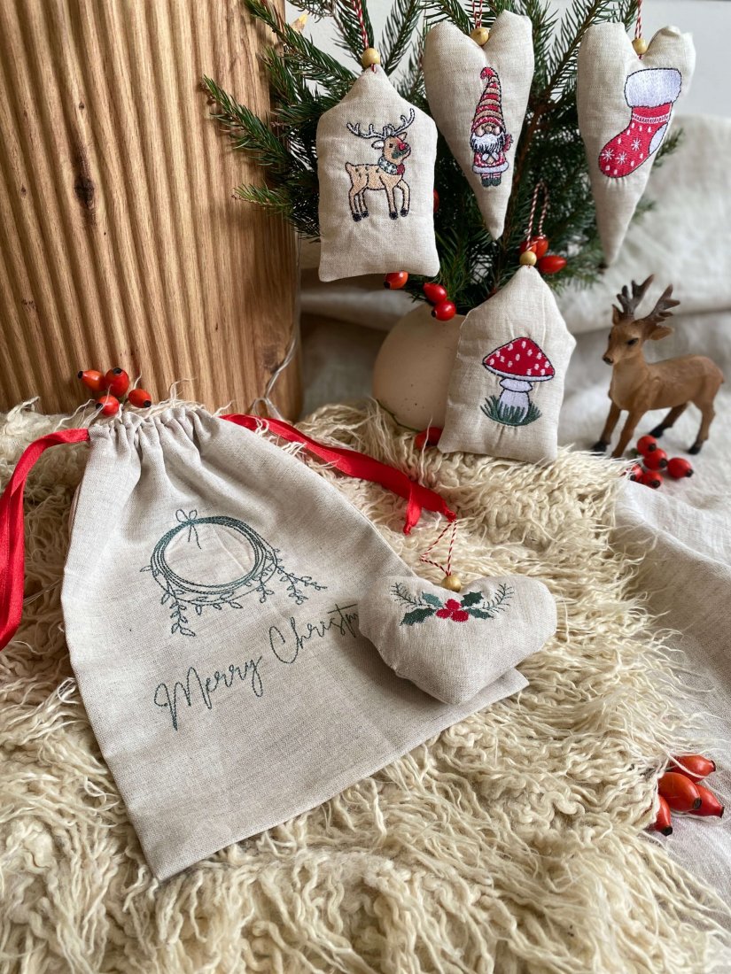 Zestaw pięciu lnianych zawieszek został wykonany z dbałością o każdy detal — ręcznie szyte, ozdobione maszynowym haftem i delikatnie wypełnione miękkim wkładem oraz kilkoma aromatycznymi goździkami, które dodają im subtelnego, zimowego zapachu.