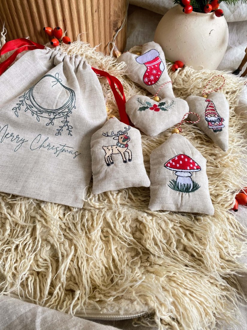 Zestaw pięciu lnianych zawieszek został wykonany z dbałością o każdy detal — ręcznie szyte, ozdobione maszynowym haftem i delikatnie wypełnione miękkim wkładem oraz kilkoma aromatycznymi goździkami, które dodają im subtelnego, zimowego zapachu.