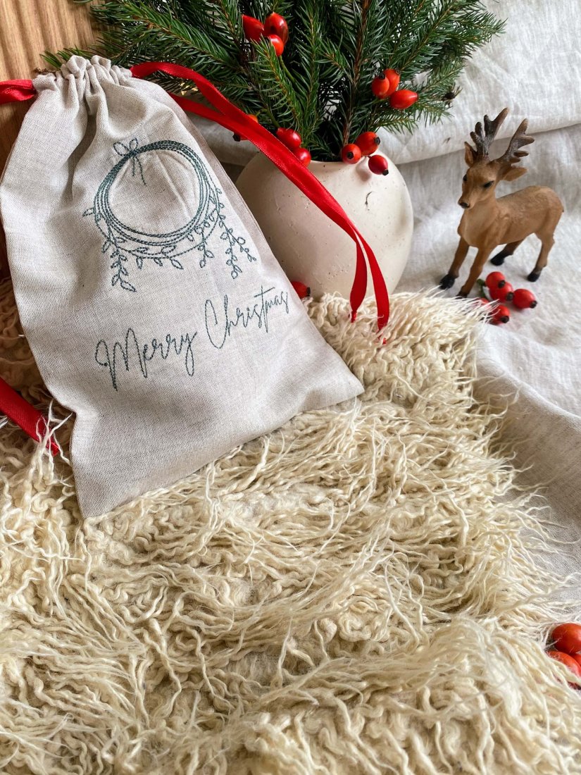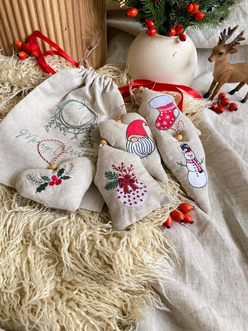 Cały zestaw zapakowany jest w lniany woreczek z haftem świątecznym, przewiązany czerwonymi wstążkami — gotowy do wręczenia jako prezent lub przechowania dekoracji.