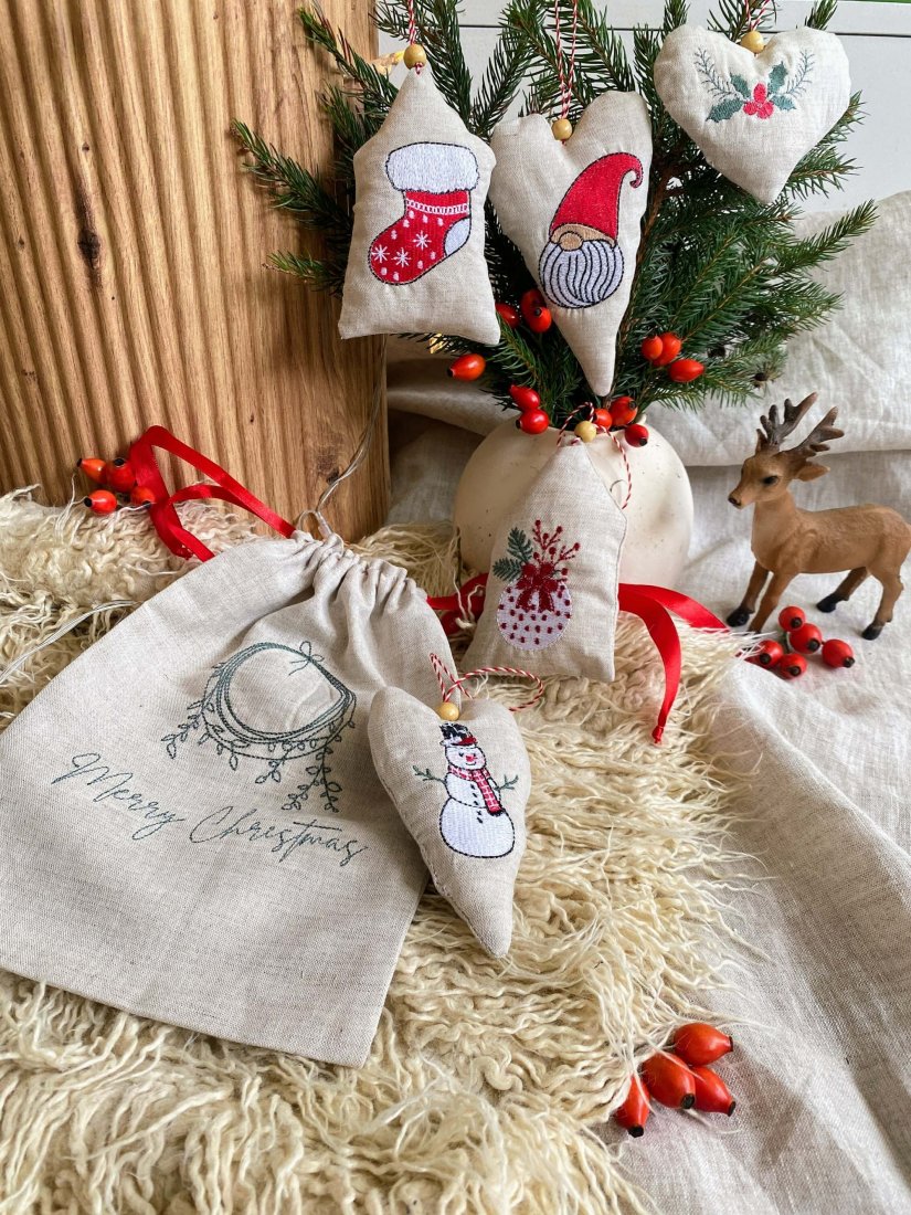Zestaw pięciu lnianych zawieszek został wykonany z dbałością o każdy detal — ręcznie szyte, ozdobione maszynowym haftem i delikatnie wypełnione miękkim wkładem oraz kilkoma aromatycznymi goździkami, które dodają im subtelnego, zimowego zapachu.