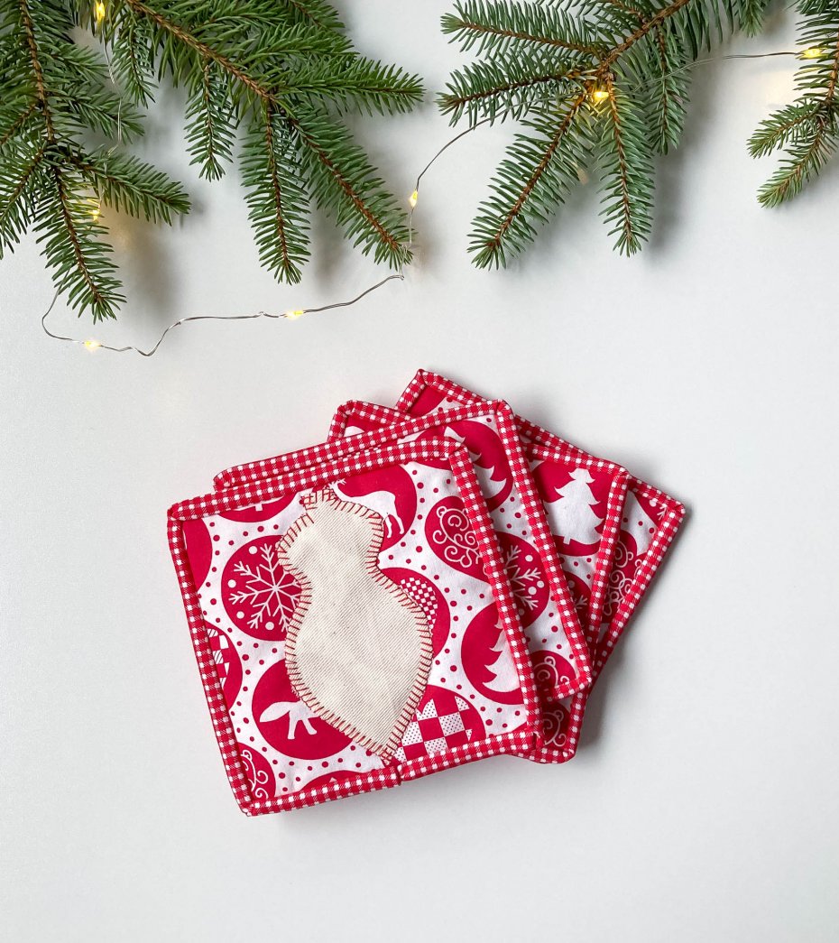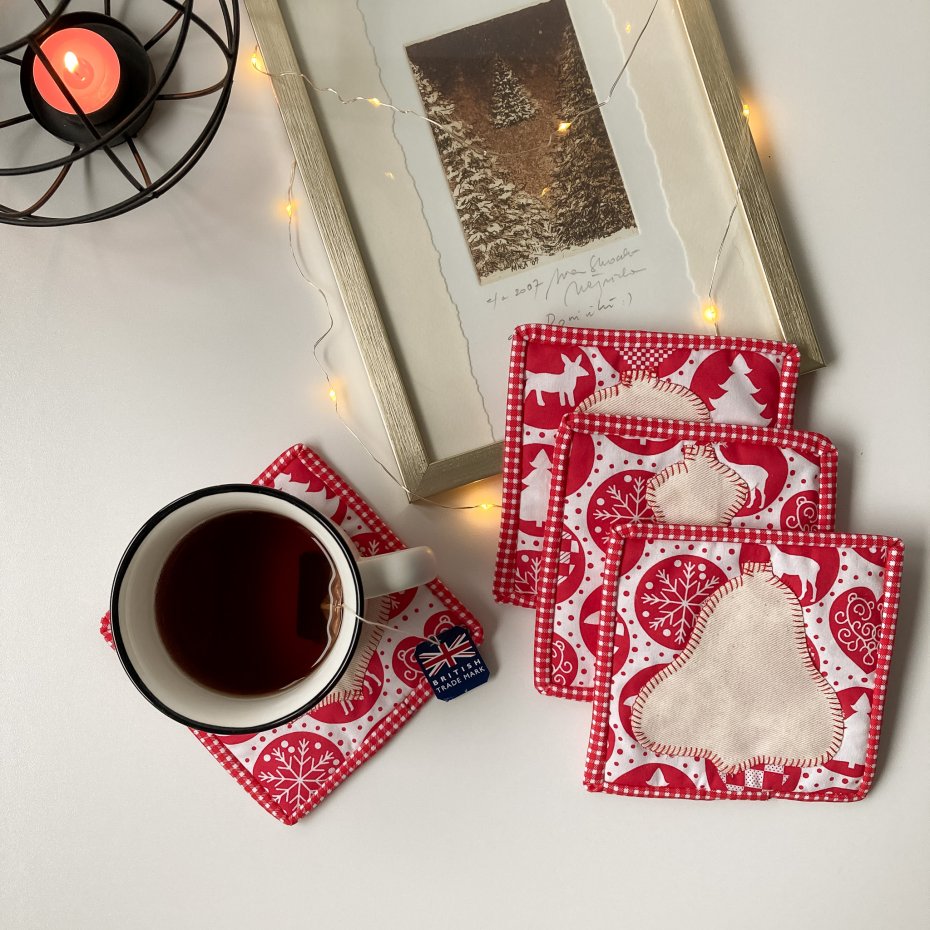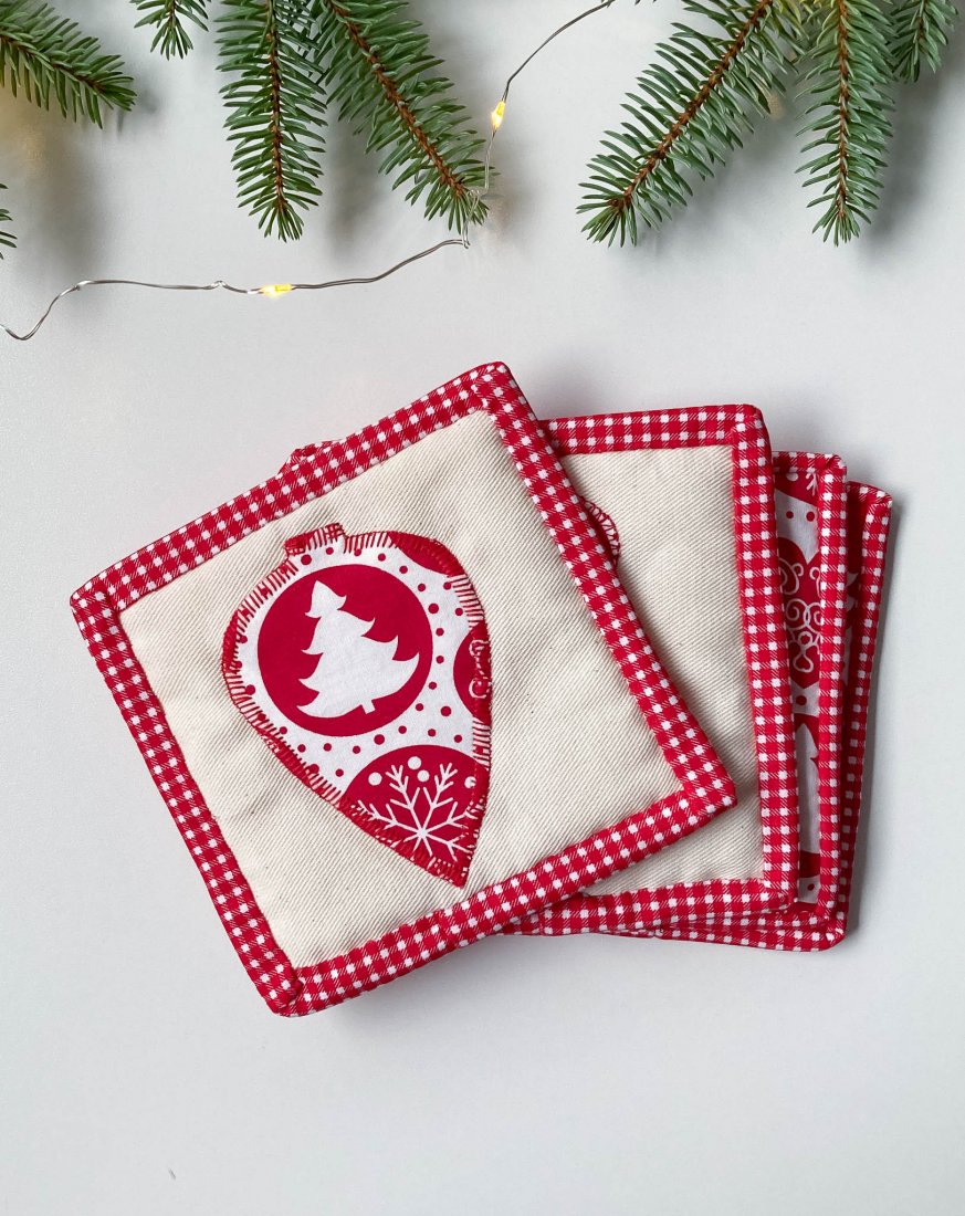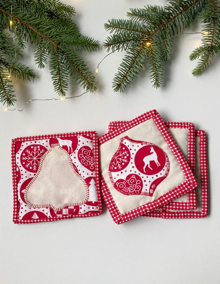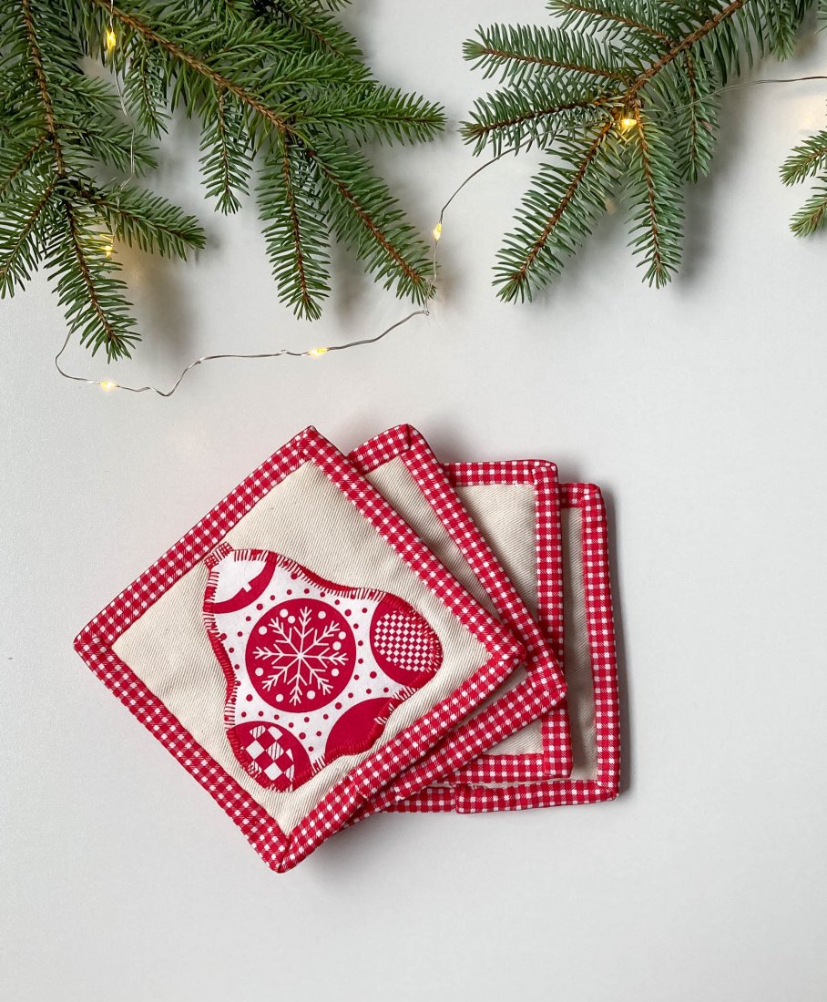 Komplet 4 szt. podkładek pod kubki w czerwieni, ze świątecznym motywem, udekorują stół, będąc jednocześnie jego, bądź bieluśkiego obrusu praktyczną ochroną.