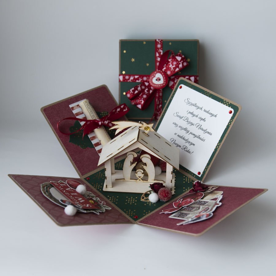 Na środku pudełka znajduje się miniaturowa świąteczna szopka, boki zdobią motywy świąteczne. Na jednej ze ścianek znajduje się wstążka, którą przymocujesz banknoty lub kartę podarunkową (ścianka ma wymiary 10x10cm, więc sprawdź wymiary karty/bonu prezentowego).