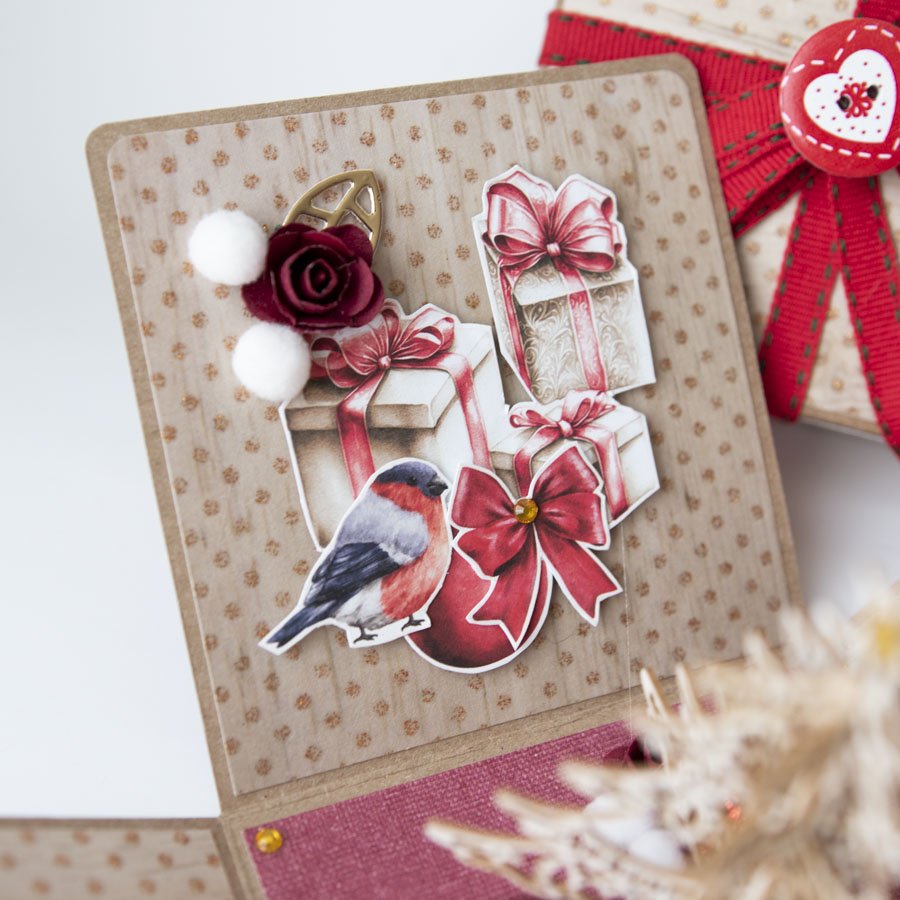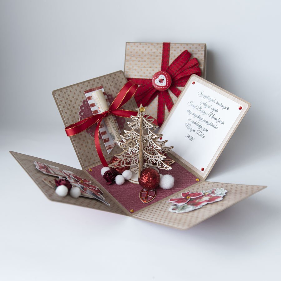 Na środku pudełka znajduje się miniaturowa choinka, boki zdobią motywy świąteczne. Na jednej ze ścianek znajduje się wstążka, którą przymocujesz banknoty lub kartę podarunkową (ścianka ma wymiary 10x10cm, więc sprawdź wymiary karty/bonu prezentowego).