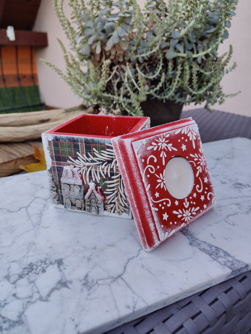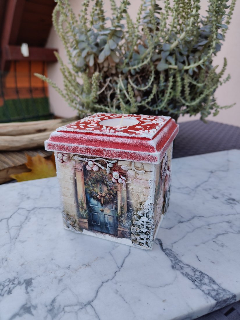 Wyjątkowa ręcznie zdobiona dekoracja do domu, wykonana techniką decoupage. To urocze pudełko w świątecznym stylu może pełnić funkcję świecznika – na jego pokrywce można umieścić świeczkę typu tealight, tworząc ciepły, nastrojowy klimat.