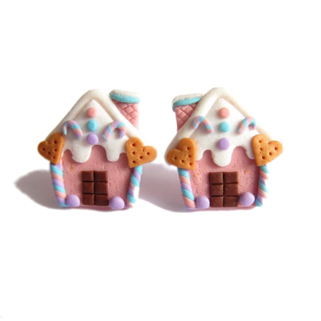 Zabawne kolorowe kolczyki wykonane ręcznie z masy termoutwardzalnej Fimo w kształcie domków z piernika. Wielkość kolczyków to ok. 1,3 cm. Sztyfty wykonane są ze stali chirurgicznej. Kolczyki świetne na prezent. Zobacz moją całą galerię w Decobazaar!