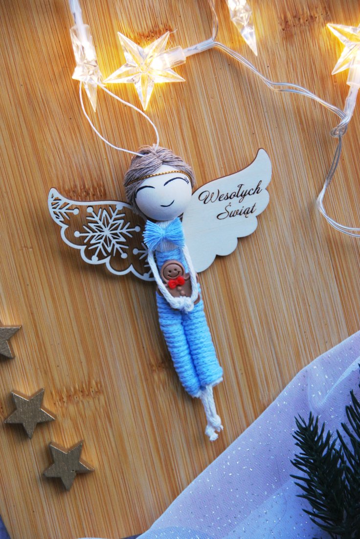 Aniołek ubrany jest w niebieski strój z miękkiego sznurka, z delikatnymi drewnianymi skrzydłami ozdobionymi śnieżynką i napisem "Wesołych Świąt". W jego ramionach spoczywa maleńka figurka, symbolizująca ciepło, opiekę i rodzinne więzi.