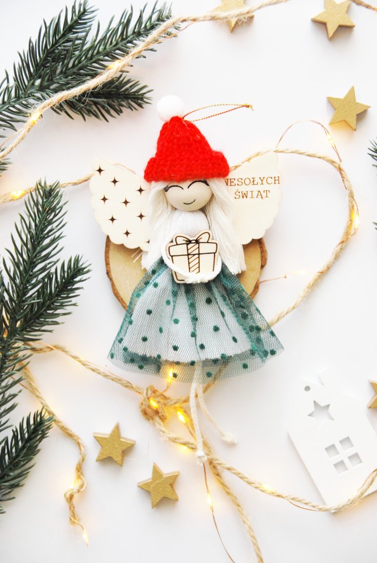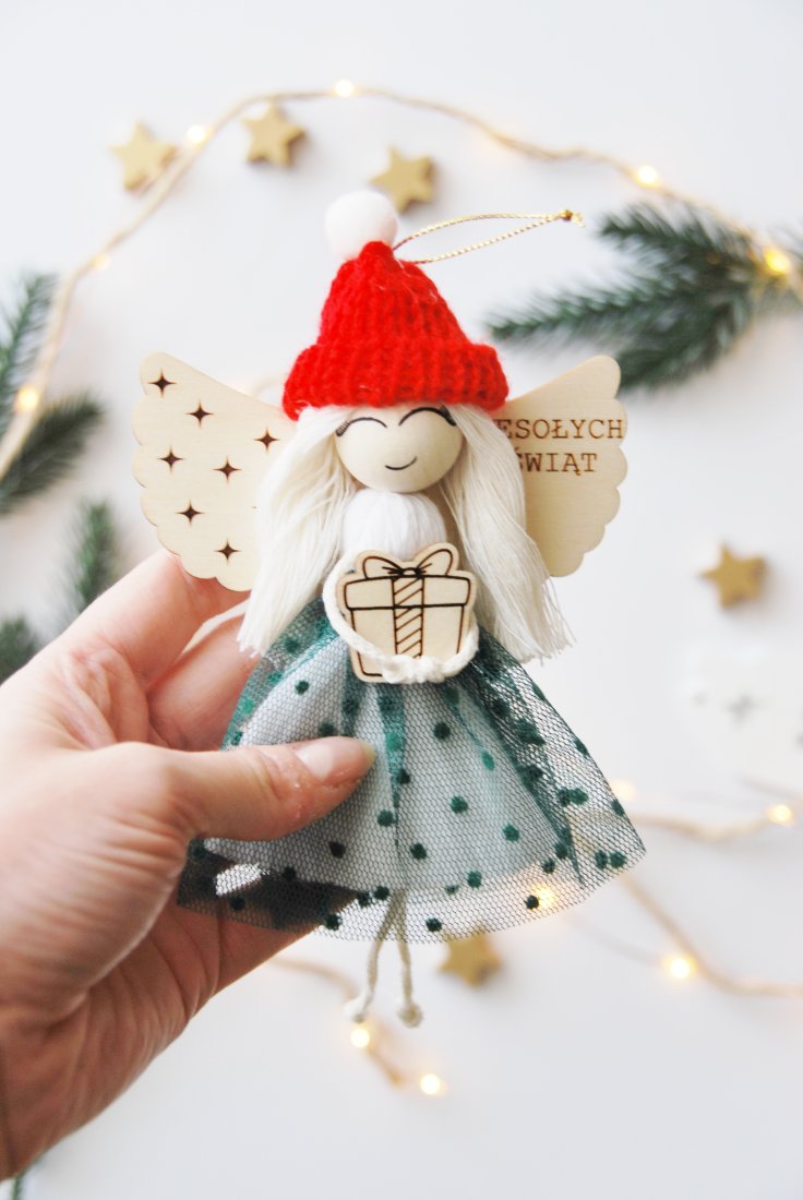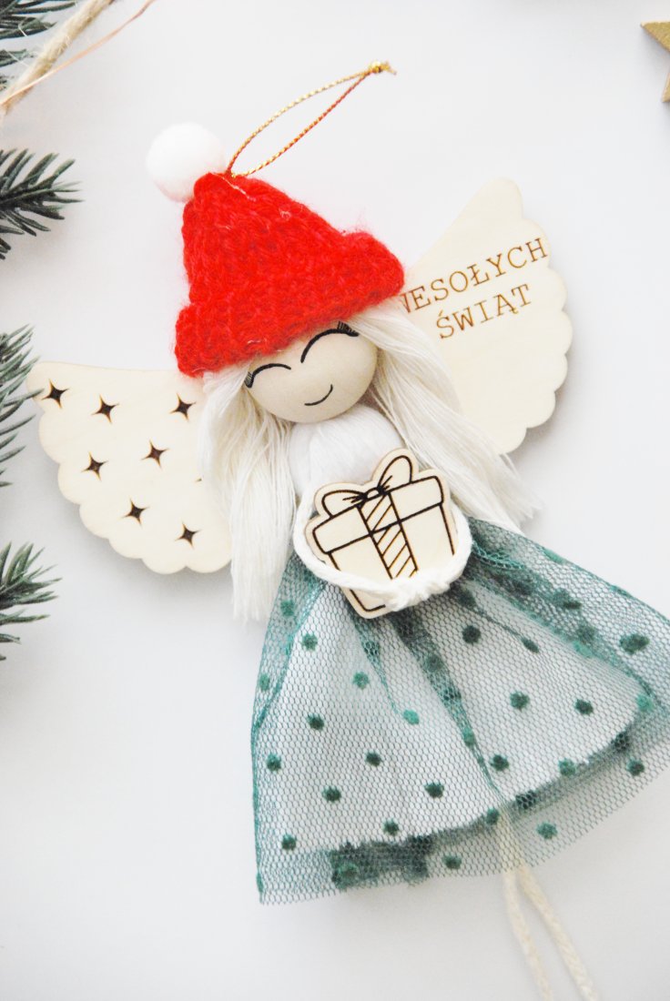 Aniołek ma drewniane skrzydełka z grawerem "Wesołych Świąt" , miękkie włosy z jasnego sznurka oraz czerwoną, dzierganą czapeczkę z białym pomponem. Ubrany jest w sukienkę z tiulem w groszki, a w rączkach trzyma drobny prezent – symbol radości i obdarowywania.