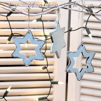 Któż z nas nie marzył, nie śpiewał o gwiazdce z nieba. Tu okazja do posiadania aż trzech na własność- dwie z wyciętymi środkami, jedna pełna. Komplet trzech białych zawieszek, ręcznie malowanych kilkoma warstwami farby, postarzanych w stylu shabby chic. Sprawdzą się nie tylko jako piękne świąteczne ozdoby ale i dekoracja całoroczna, dodatek do większego prezentu, drobny upominek. Polecam.