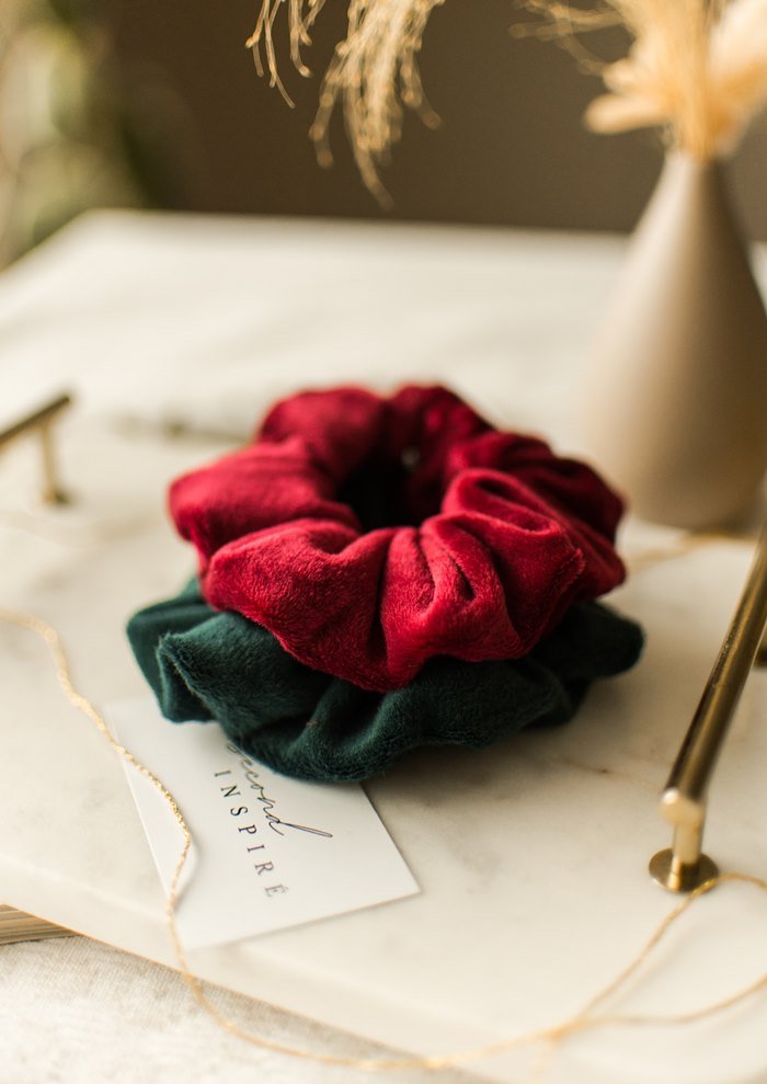 Świąteczny zestaw scrunchies (bordowa i butelkowa) z welurowego materiału.