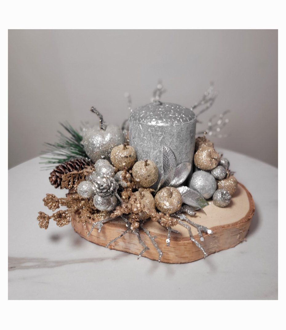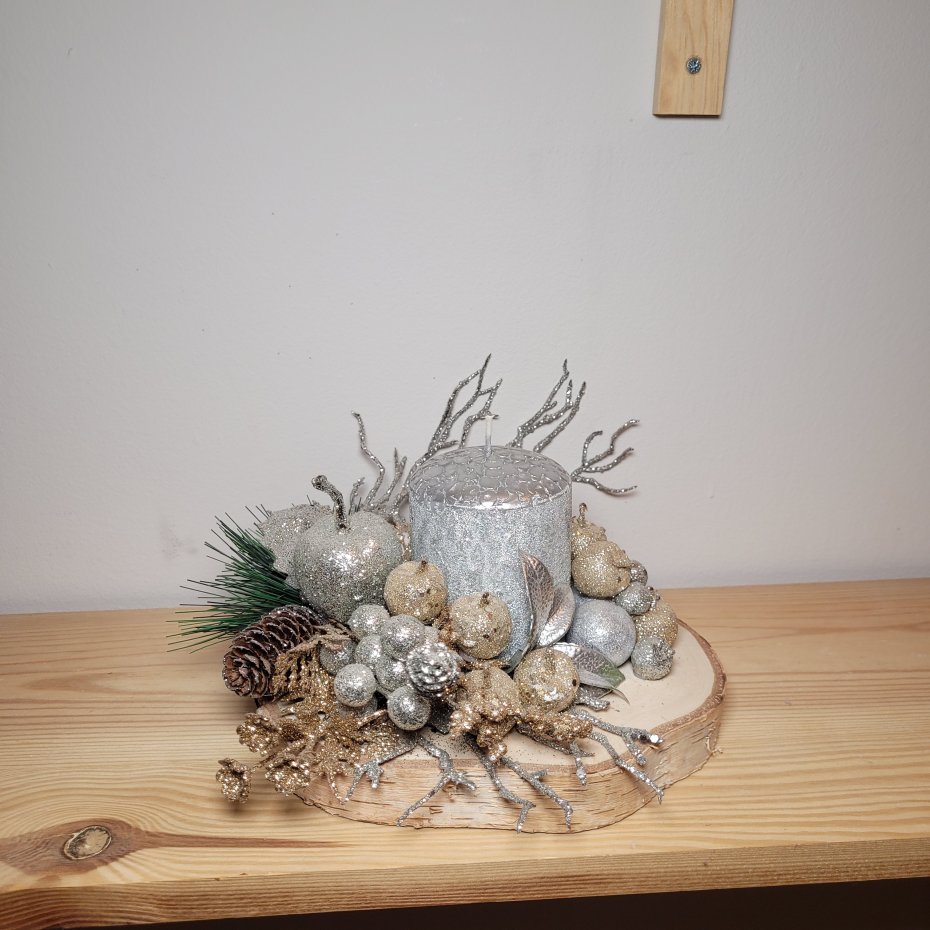 Stwórz magiczną, świąteczną atmosferę dzięki tej eleganckiej dekoracyjnej kompozycji! W centrum znajduje się srebrna świeca otoczona błyszczącymi złotymi i srebrnymi kulkami, szyszkami oraz gałązkami z efektem szronu.