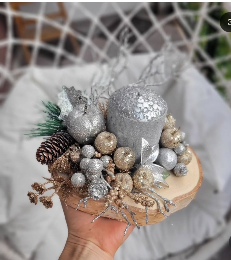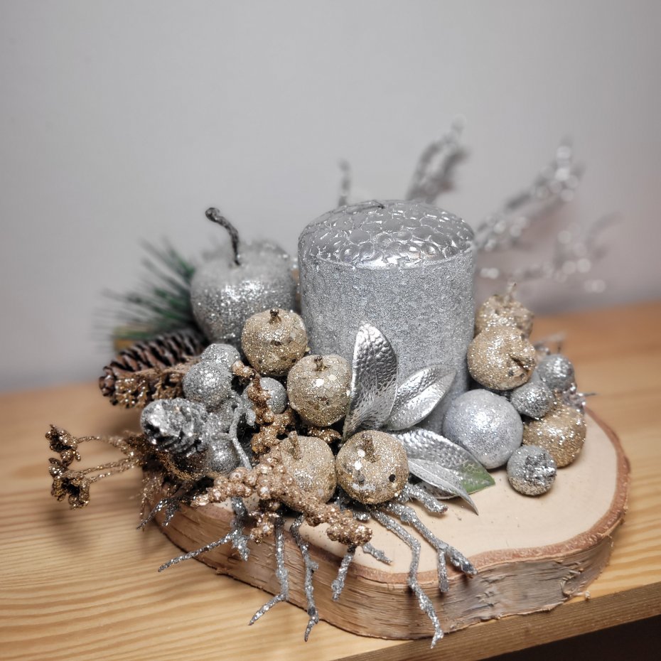 Materiały: elementy dekoracyjne, świeca, drewno, sztuczna zieleń