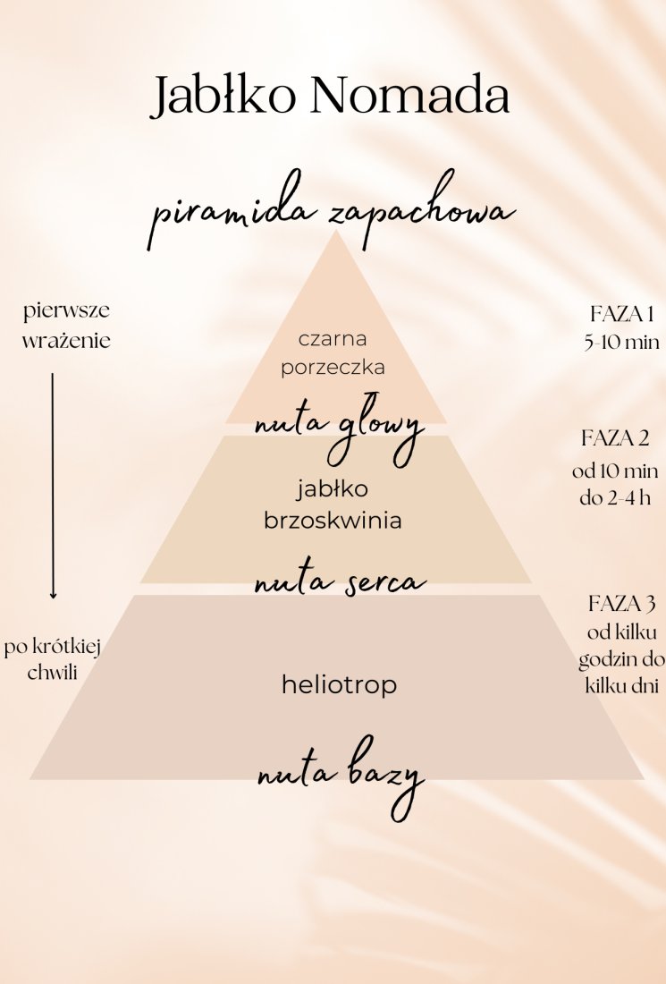 Zatrzymaj się na chwilę i poczuj energię beztroskiej wędrówki przez owocowe gaje. Jabłko Nomada to kompozycja radosna i pełna życia, w której soczysta słodycz jabłka oraz brzoskwini spotyka się z cierpkim akcentem czarnej porzeczki. To zapach optymistyczny, świeży i nasycony słońcem.
