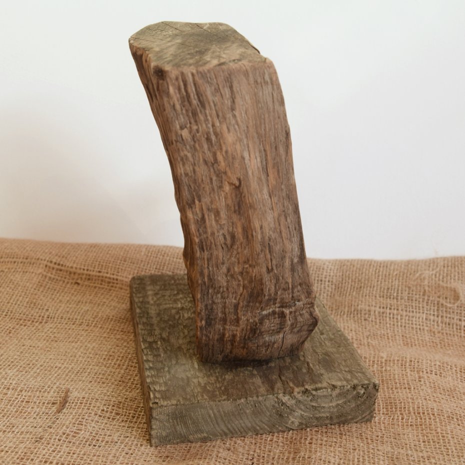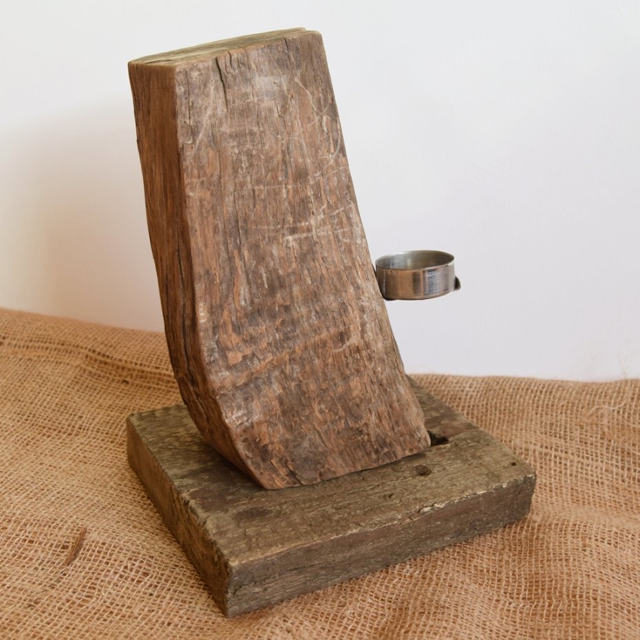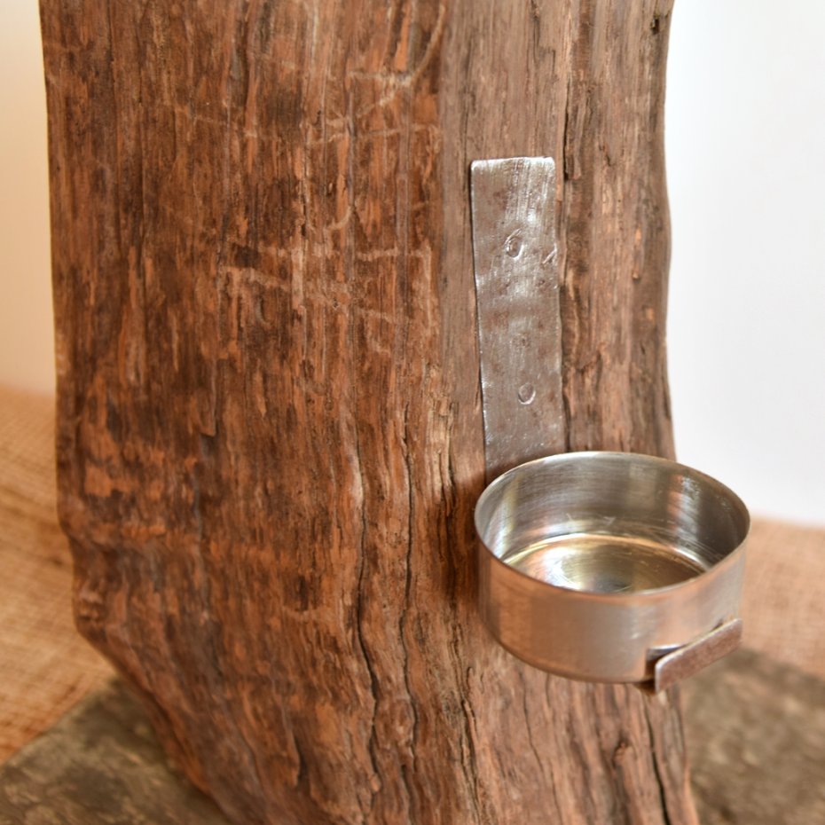 Świecznik wykonany z drewna wyrzuconego przez morze na bałtyckiej plaży, starej deski i starej blachy. Prosty, surowy styl, wykorzystaniem starego drewna z jego niedoskonałościami i otworami po gwoździach nawiązujący do stylu wabi-sabi. Metalowa podstawka mieści typowy wkład/ świeczkę typu T-light. Wymiary podstawy - 18,5 x 15,5 cm, wysokość całkowita ok. 27 cm. Jedyny, niepowtarzalny egzemplarz.