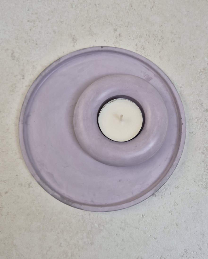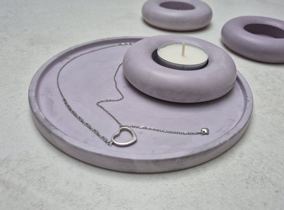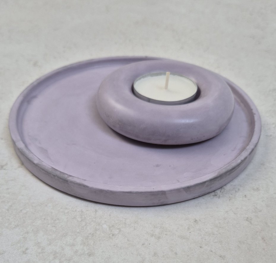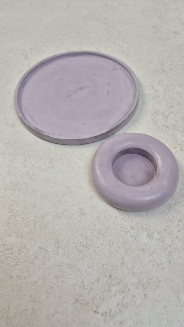 prostej, okrągłej tacki oraz świecznika na tealight. Ręczne wykonanie sprawia, że każdy zestaw ma niepowtarzalny charakter.