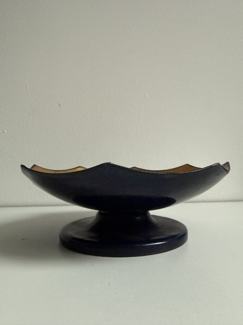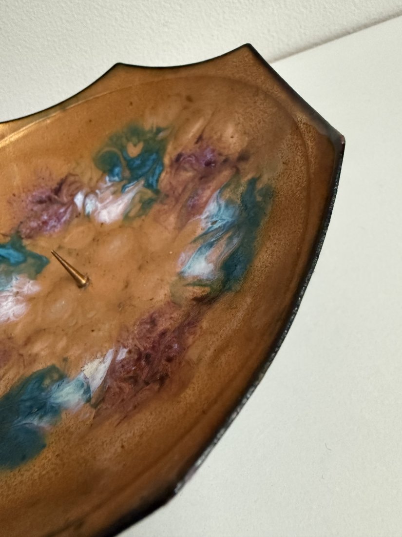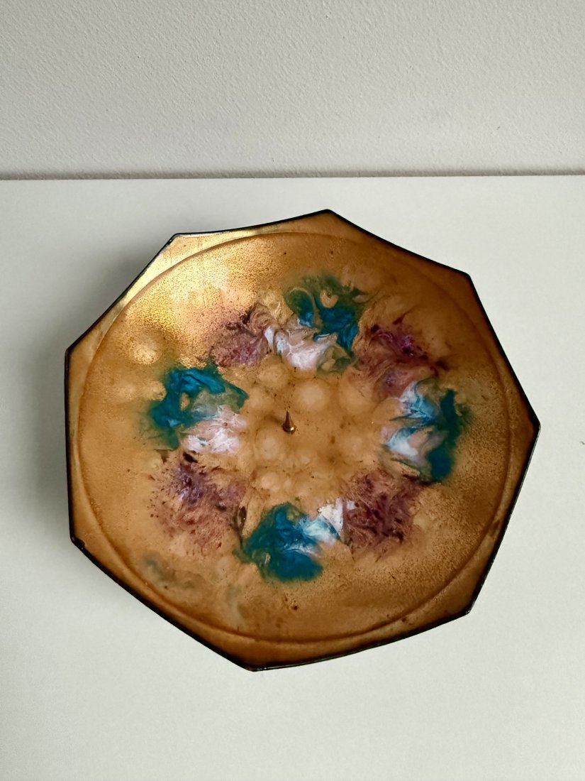 Miedziany świecznik emaliowany z połowy XX wieku z nóżką, ręcznie robiony, misa emaliowana, kształt sześciokątny, vintage, retro, Niemcy Zachodnie. Lekkie ślady użytkowania, wszystko na zdjęciach. Średnica 16cm. Wysokość 5cm.