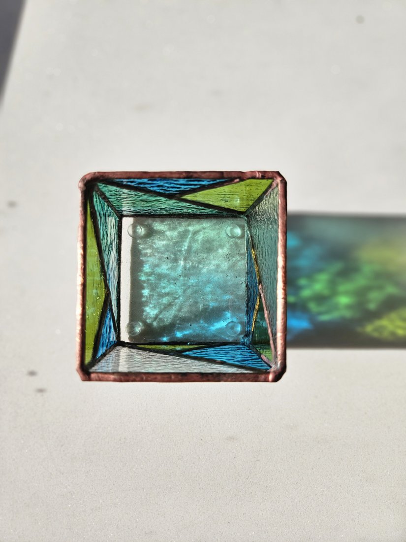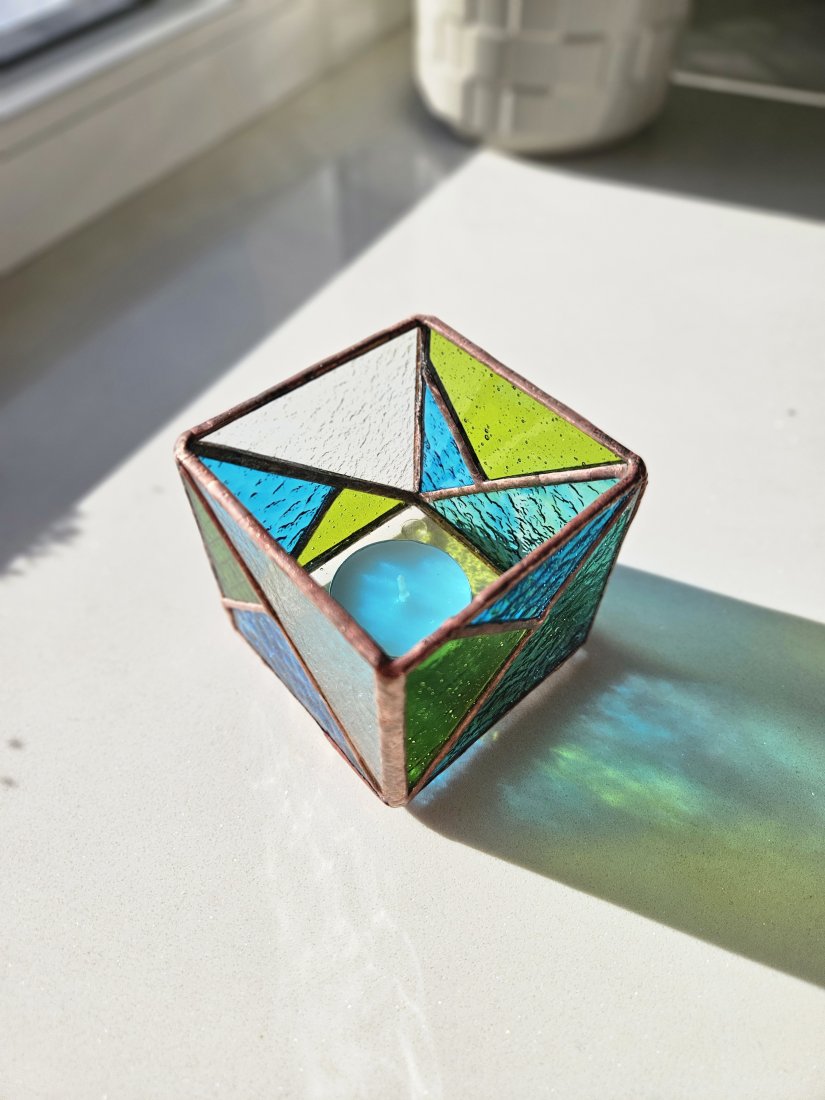 Świecznik przeznaczony jest na świeczki typu tealight lub małe lampki led. Od spodu ma silikonowe nóżki, zabezpieczające przez rysowaniem powierzchni. Wszelkie nierówności i kolor patyny wynikają ze specyfiki materiału oraz ręcznego lutowania w technice witrażowej. Dodaje to unikalnego charakteru każdemu przedmiotowi.