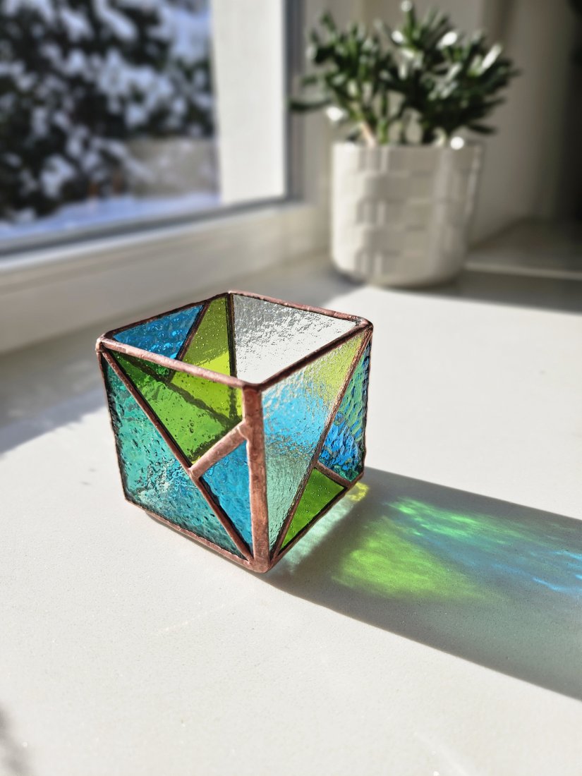 Świecznik/lampion robiony ręcznie ze szkła witrażowego techniką Tiffany. Gra ze światłem, zachwyca kolorami, fakturą i za każdym razem wygląda inaczej. Szkło dobrane zostało w odcieniach błękitu, turkusu i zieleni. Patyna w kolorze miedzi.