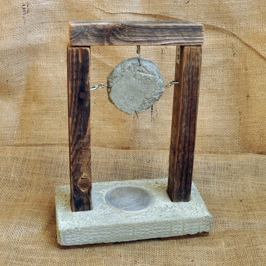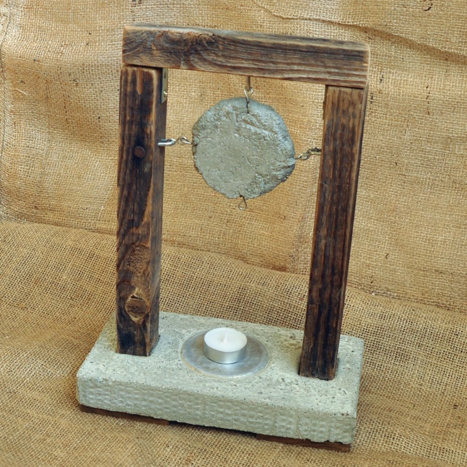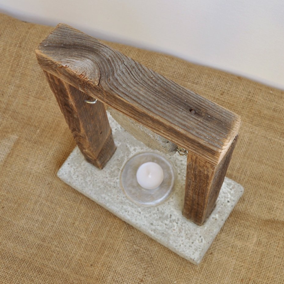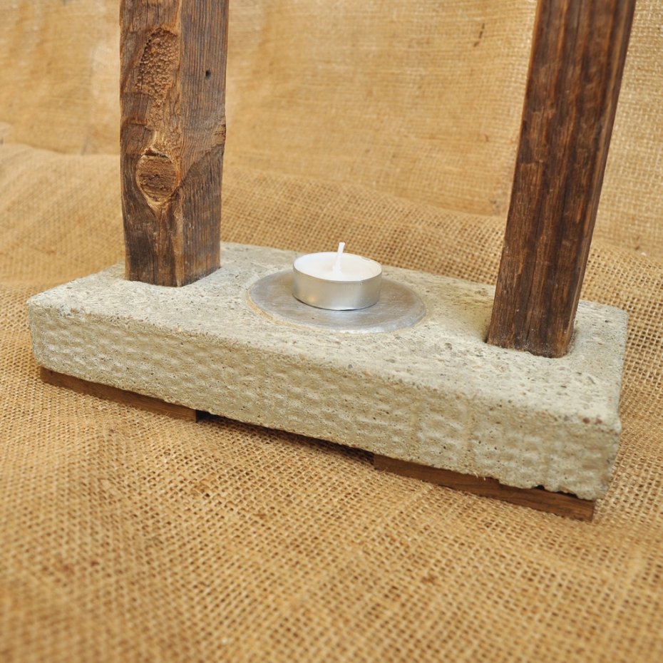 Świecznik wykonany z betonu i starego drewna. Nierówności betonu i drewna, stare gwożdzie, industrialne wykończenia sprawiają, że świecznik jest unikalny. Mieści świeczkę-podgrzewacz (tzw. T-light) a także tradycyjną świeczkę do ok. 7 cm średnicy, może też służyć jako samodzielny element dekoracji w stylu industrialnym. Wysokość ok. 32 cm, wymiary podstawy betonowej - 23/12 cm. Beton jest szlifowany i zabezpieczony specjalnym impregnatem, od spodu drewniane "nóżki".