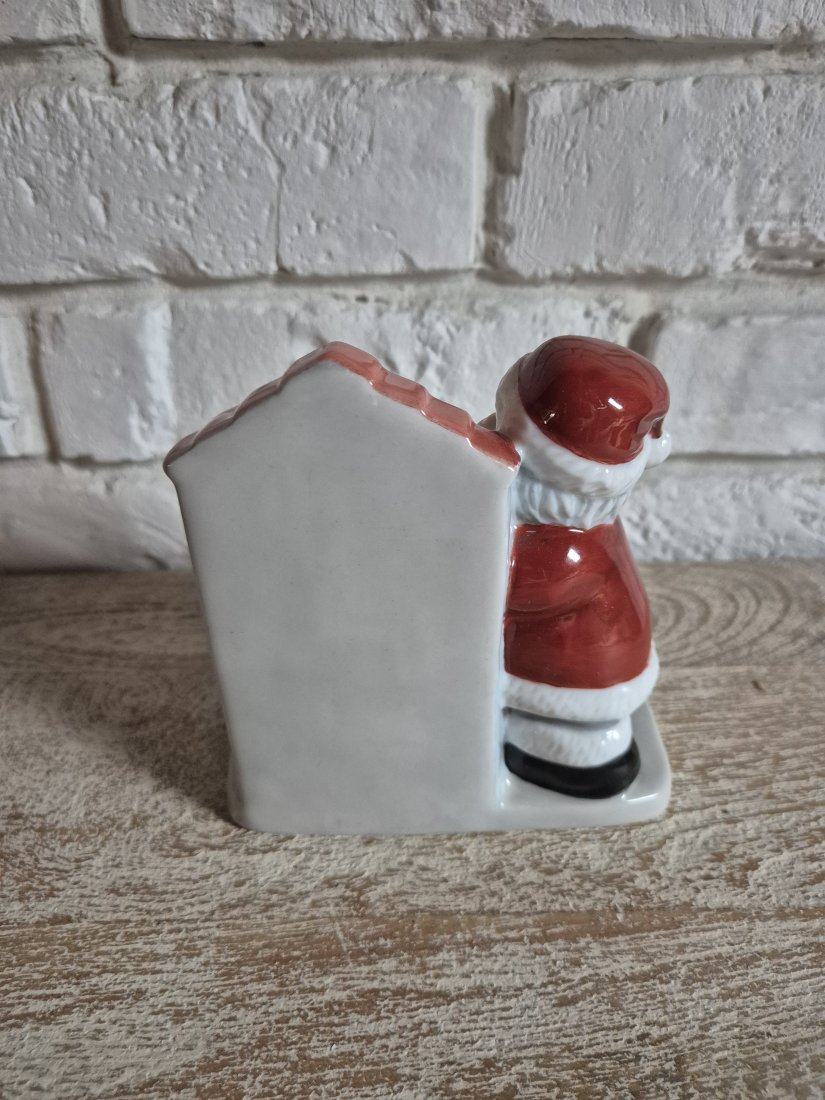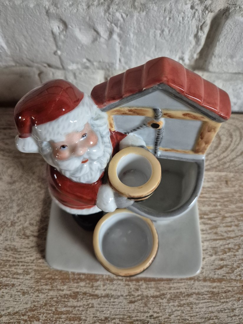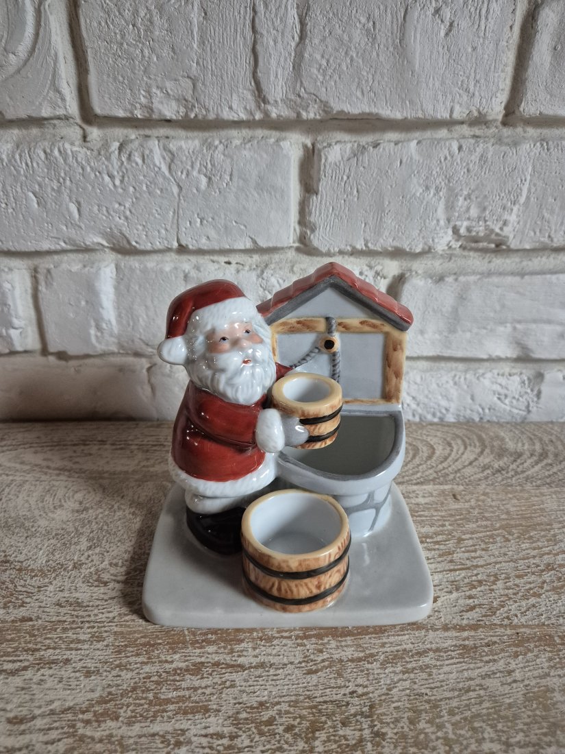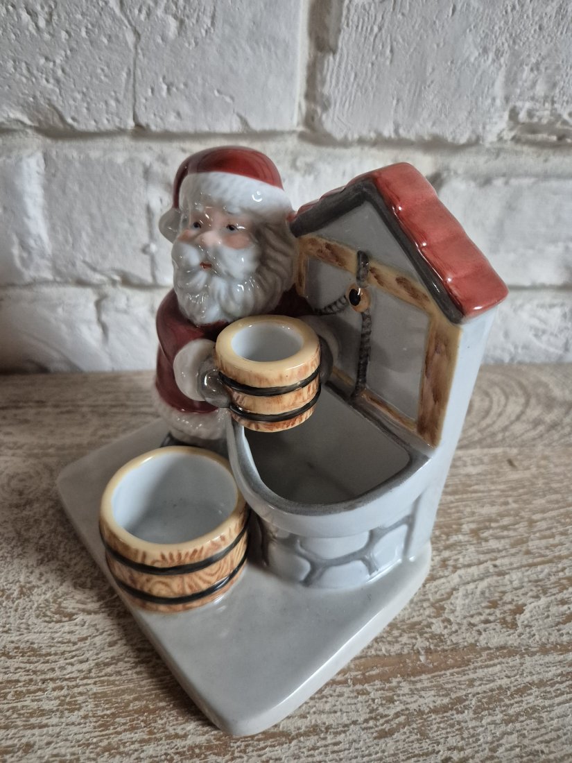 ceramiczny skandynawski świecznik świąteczny z Mikołajem stojącym przy studni, posiada dwa miejsca na świeczkę do wyboru - na tealight i na długą świeczkę, od spodu imię i nazwisko projektantki, dosyć ciężki