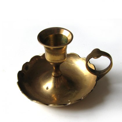 Piękny, mały świecznik z uchem, wykonany z mosiądzu. Idealny na stół z długą, prostą świeczka, a także idealna podstawa na świąteczny stroik. polecam