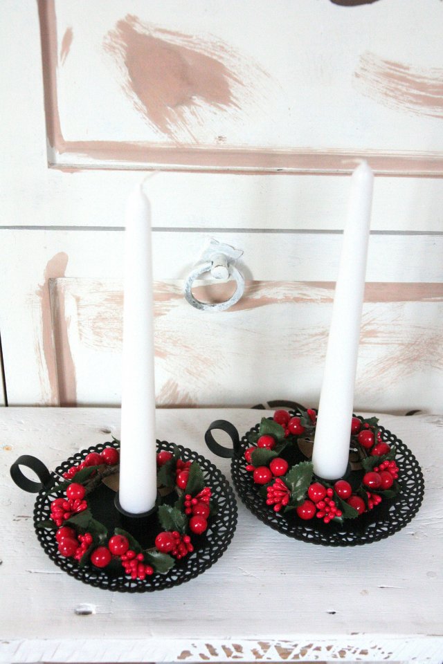 Dwa fajne, metalowe świeczniki. Ażurowe w czarnym kolorze. "Ładnie" przybrane będą oryginalną ozdobą stołu.