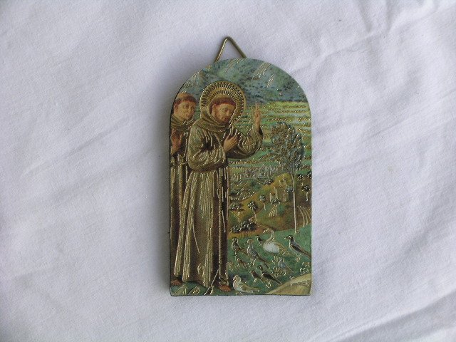 Mały drewniany obrazek ikonowy. Nadruk ze złoceniami, lekko fakturowy. Ta scena z życia św. Franciszka jest wiecznie żywa :) 7,5 x 4,5 cm. Stan zachowania bardzo dobry.